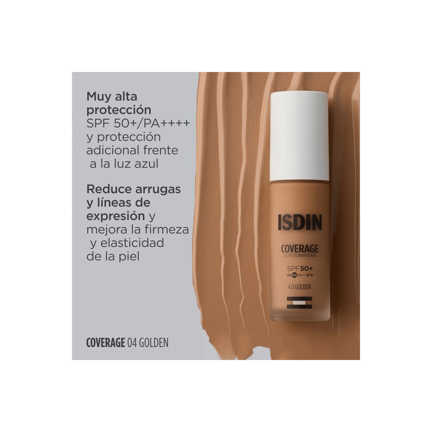 Foundation with very high protection SPF50+. With sun filters and active ingredients that help prevent and combat the signs of skin aging caused by the sun.