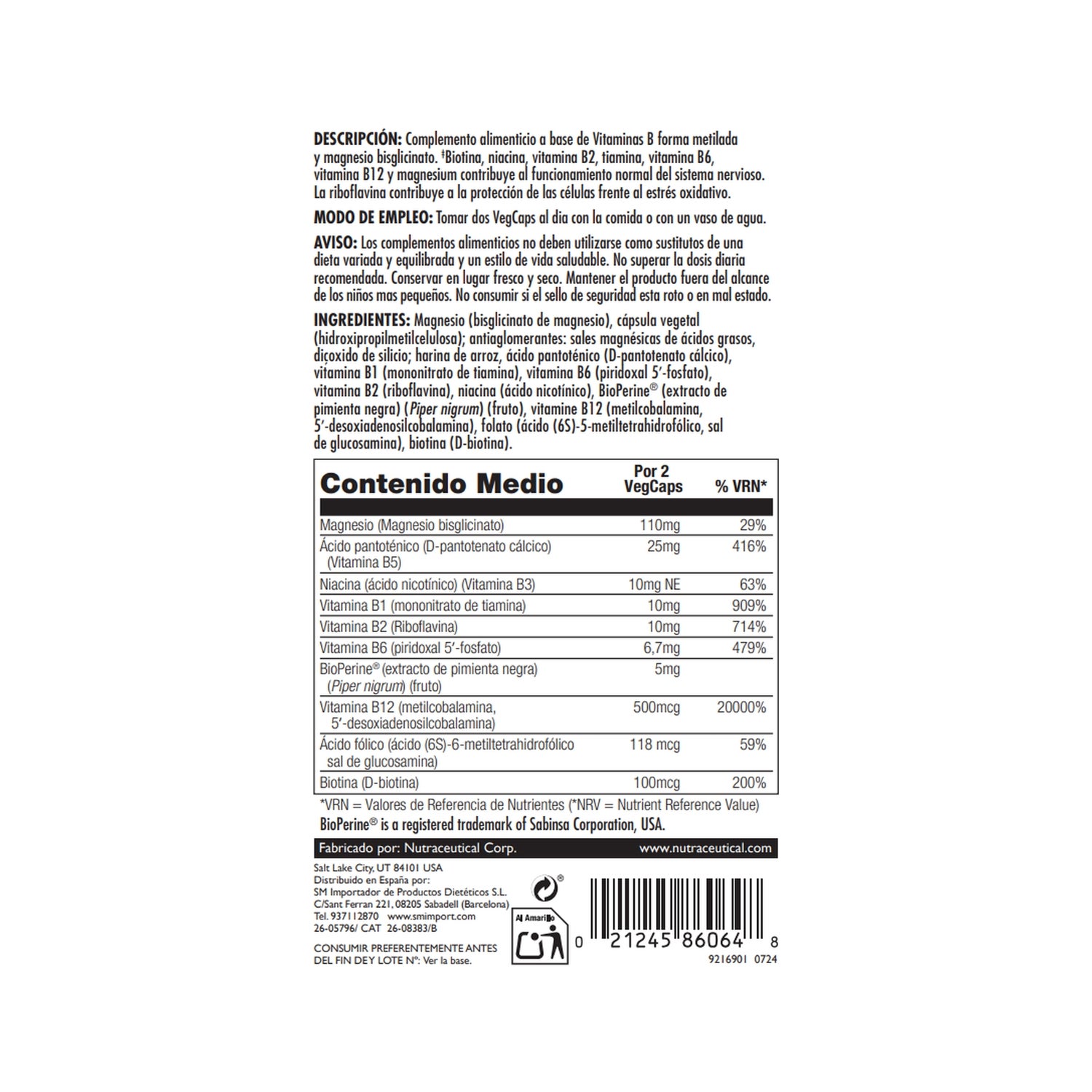 Dietary supplement in vegetable cellulose capsules, which is specially designed to help provide B vitamins with the addition of magnesium. It contains the coenzyme vitamin B-6 (P-5-P), vitamin B-12 (methylcobalamin and adenosylcobalamin) and folate (5-MTHF) as a biologically active form. It is compatible with a vegetarian diet.