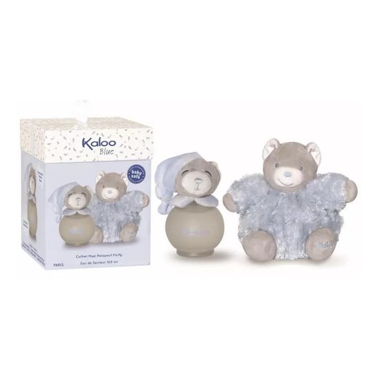 Kaloo Blue Set is a set that includes the adorable Maxi Fluffy plush toy and the Blue scented water 100 ml, ideal for pampering your baby.
