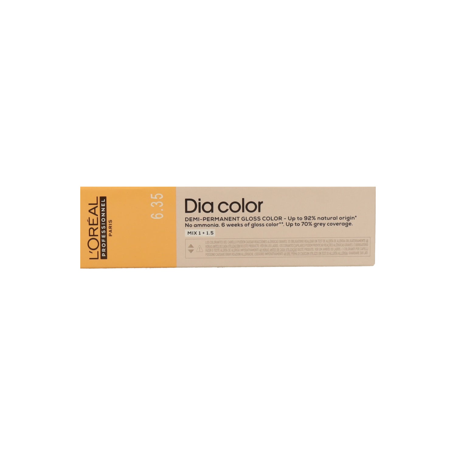 L'Oréal Dia Color 6.35 Dark Golden Mahogany Blonde is a demi-permanent ammonia-free color that offers a brilliant and natural finish. This alkaline formula allows for a gloss type color that lasts up to six weeks, in addition to providing coverage of up to 70% of white hair.