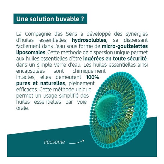 La Compagnie des Sens has developed synergies of water-soluble essential oils, which easily disperse in water in the form of liposomal microdroplets. This unique dispersion method allows the essential oils to be safely ingested in a simple glass of water.