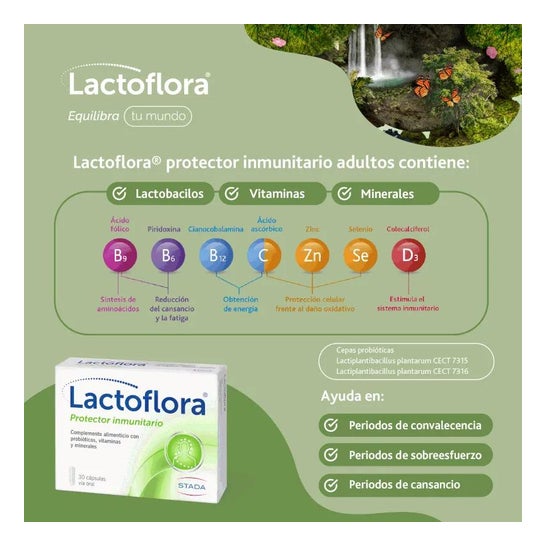 It is formulated with probiotics, vitamins (B9, B6, B12, D3, and C), minerals (Zinc, Se), and live lactic ferments from Lactiplantibacillus plantarum CECT 7315 and CECT 7316. Recommended during times when the body's defenses are compromised, such as periods of convalescence, overexertion, tiredness, and fatigue.