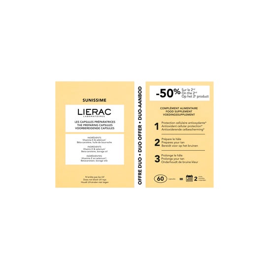 Lierac Sunissime Tanning Fast and Sublime 2x30caps is a food supplement that helps to achieve a more uniform and lasting tan.