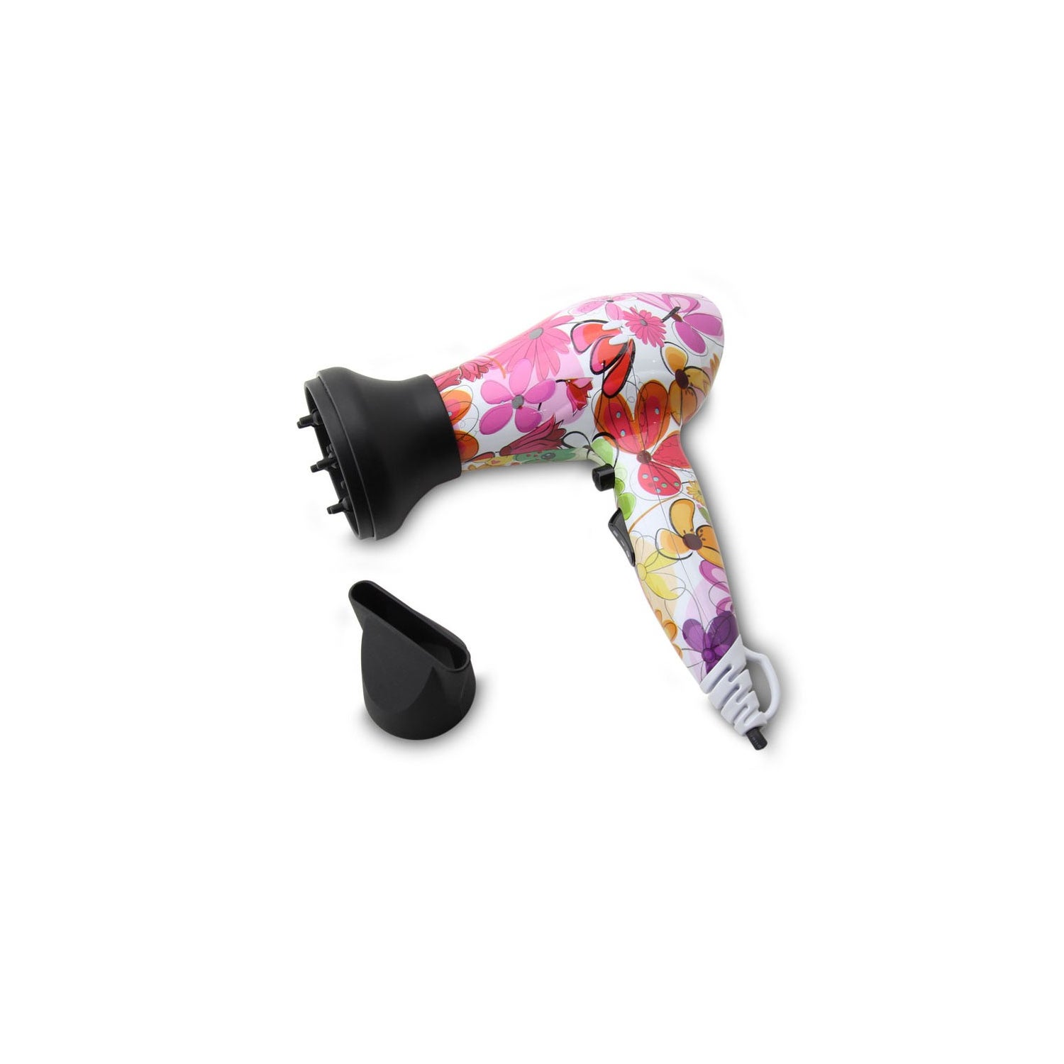 Travel hair dryer with a power of 1200W and 13cm long with cool button and a fun design with floral motifs that is specially designed to dry hair in a safe and comfortable way, even curly hair, as it includes a diffuser. It includes a carrying case for safe storage and a nozzle.
