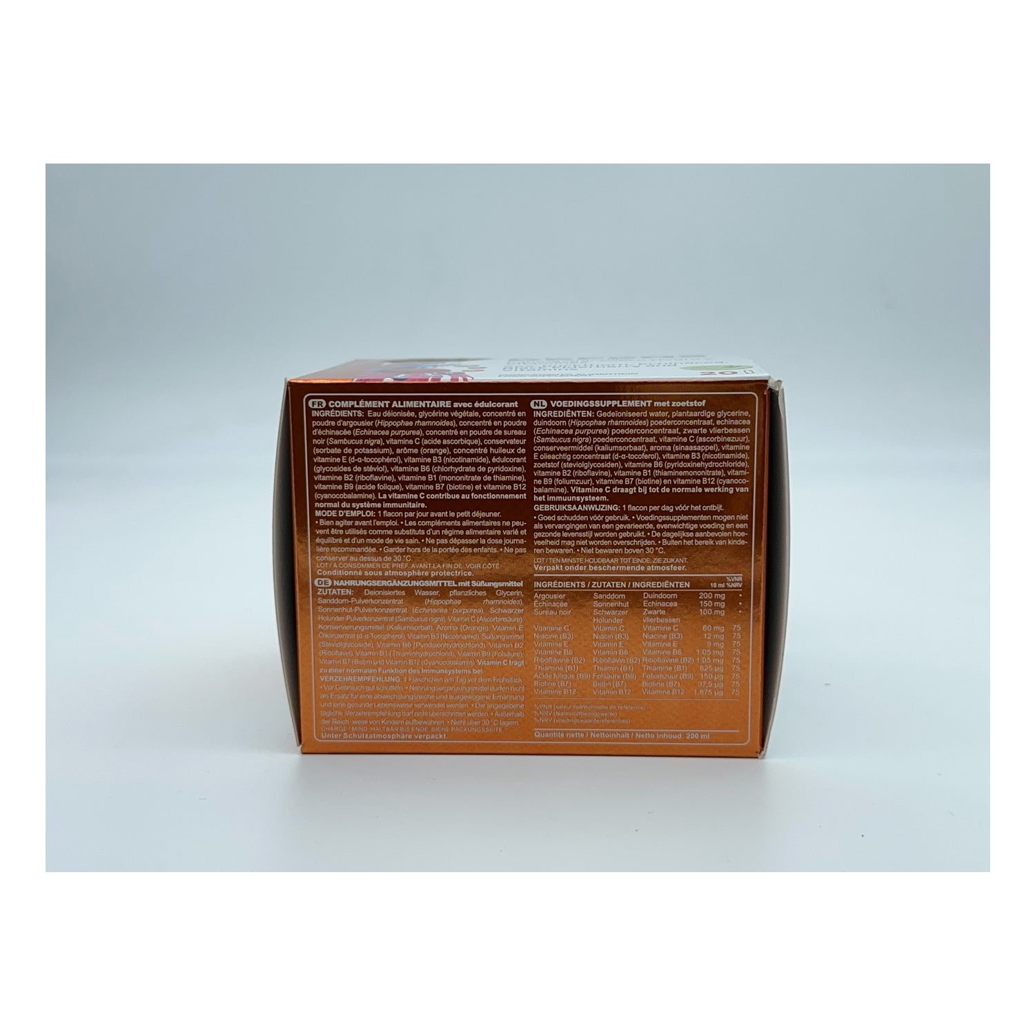 Deionized Water, Vegetable Glycerin, Sea Buckthorn (Hippophae Rhamnoides) Powder Concentrate, Echinacea (Echinacea Purpurea) Powder Concentrate, Black Elderberry (Sambucus Nigra) Powder Concentrate, Vitamin C, Niacin, Vitamin E, Vitamin B6, Riboflavin, Thiamin, Folic Acid, Biotin, Vitamin B12, Preservative (Potassium Sorbate), Sweetener (Steviol Glycosides) and Flavor.