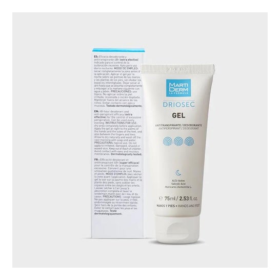 MARTIDERM® Driosec antiperspirant for hands and feet gel offers control over hyperhidrosis in hands and feet, preventing excessive sweating and improving your skin's well-being. Due to its deodorant effect, it prevents your skin from sweating and bad smells.