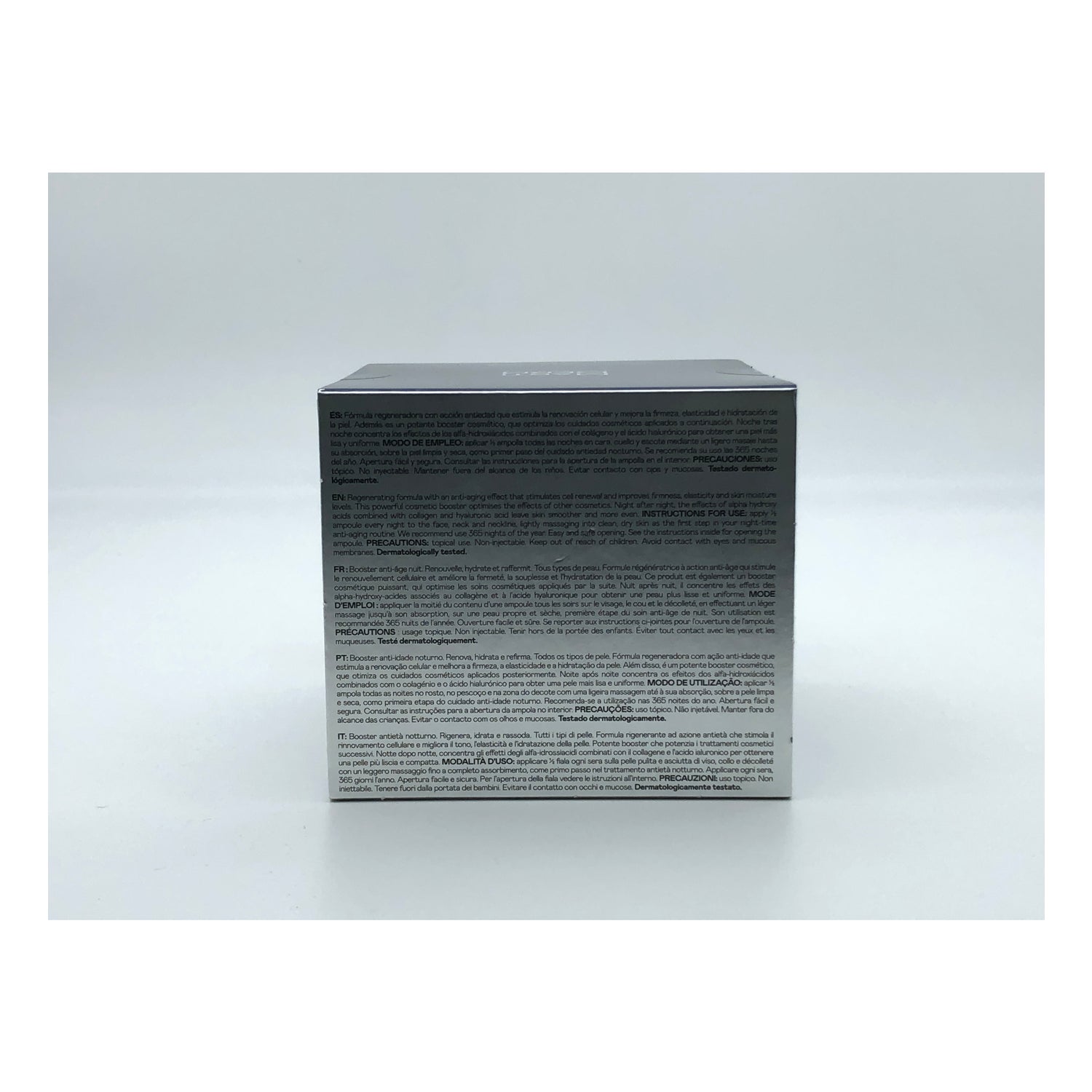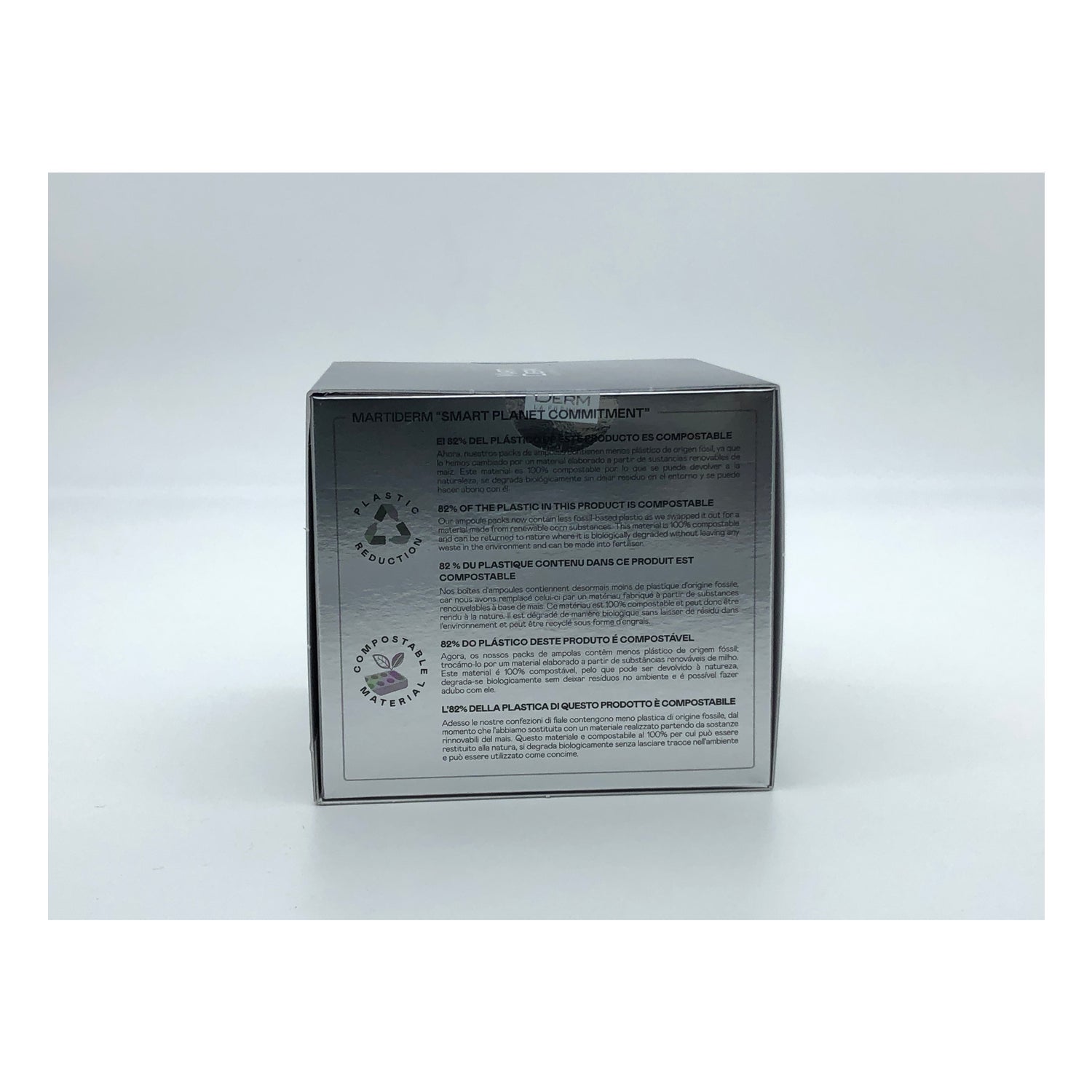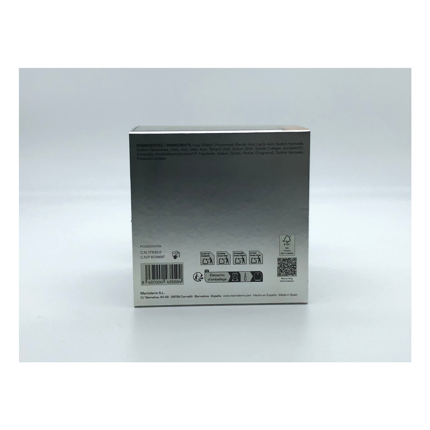 Martiderm™ Night renew Platinum 30 amp. is a product designed for night-time facial care for all skin types. These Martiderm ampoules regenerate and moisturise the skin, providing multiple effects: they unify skin tone, combat signs of aging, firm and stimulate cell renewal in the dermis. Its formula contains alpha hydroxy acids that exfoliates the superficial layers of the skin. It is also rich in marine collagen that together with hyaluronic acid creates a film on the skin that prevents skin dehydration and promotes the generation of collagen and elastin.