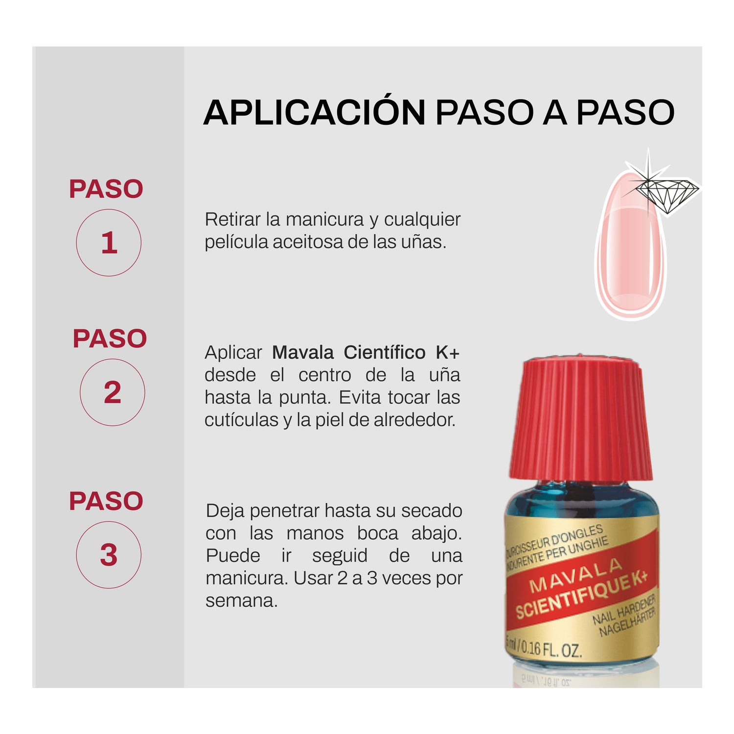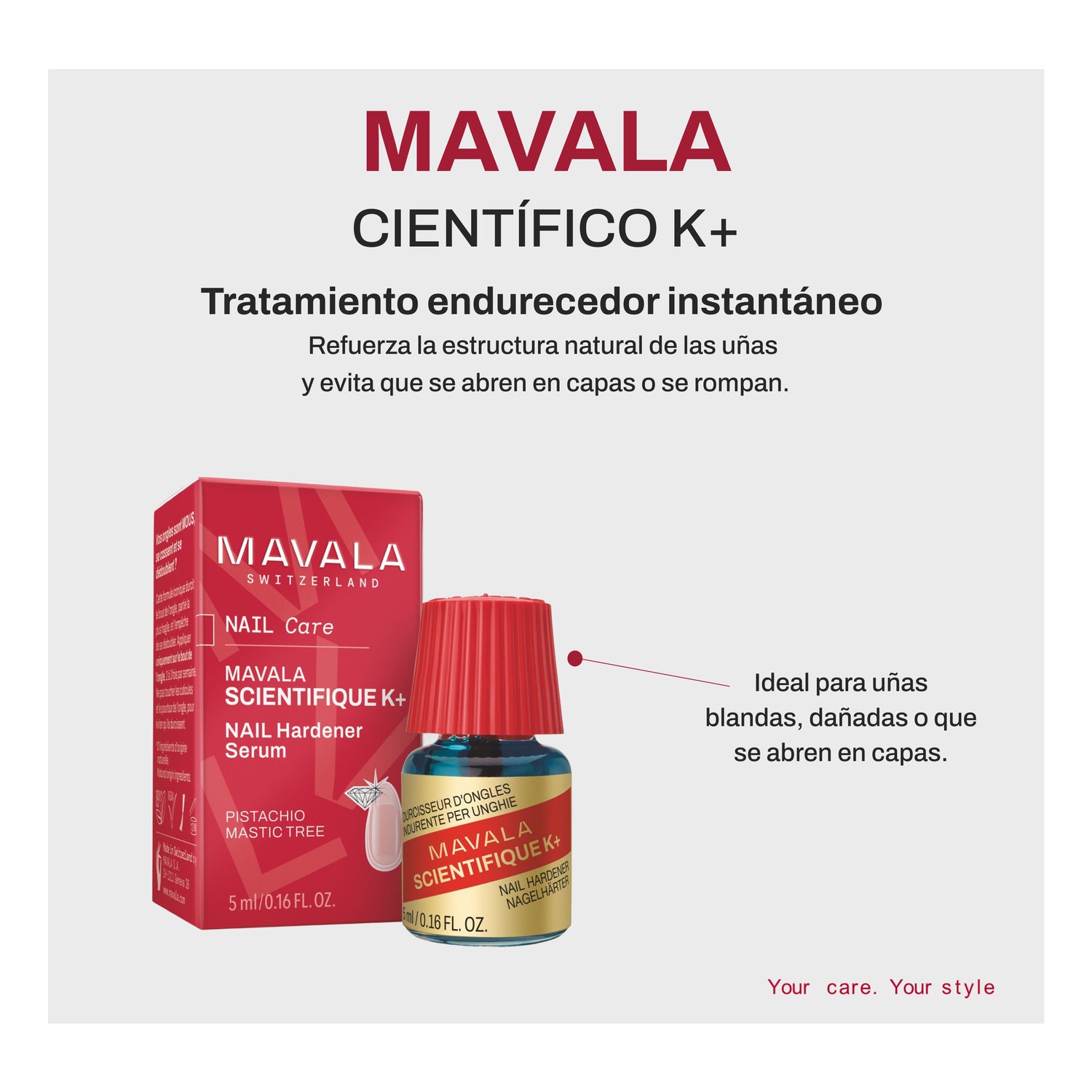 Mavala Scientific K+ Nail Hardener 5ml is an aqueous solution that hardens soft nails and helps prevent them from breaking or separating.