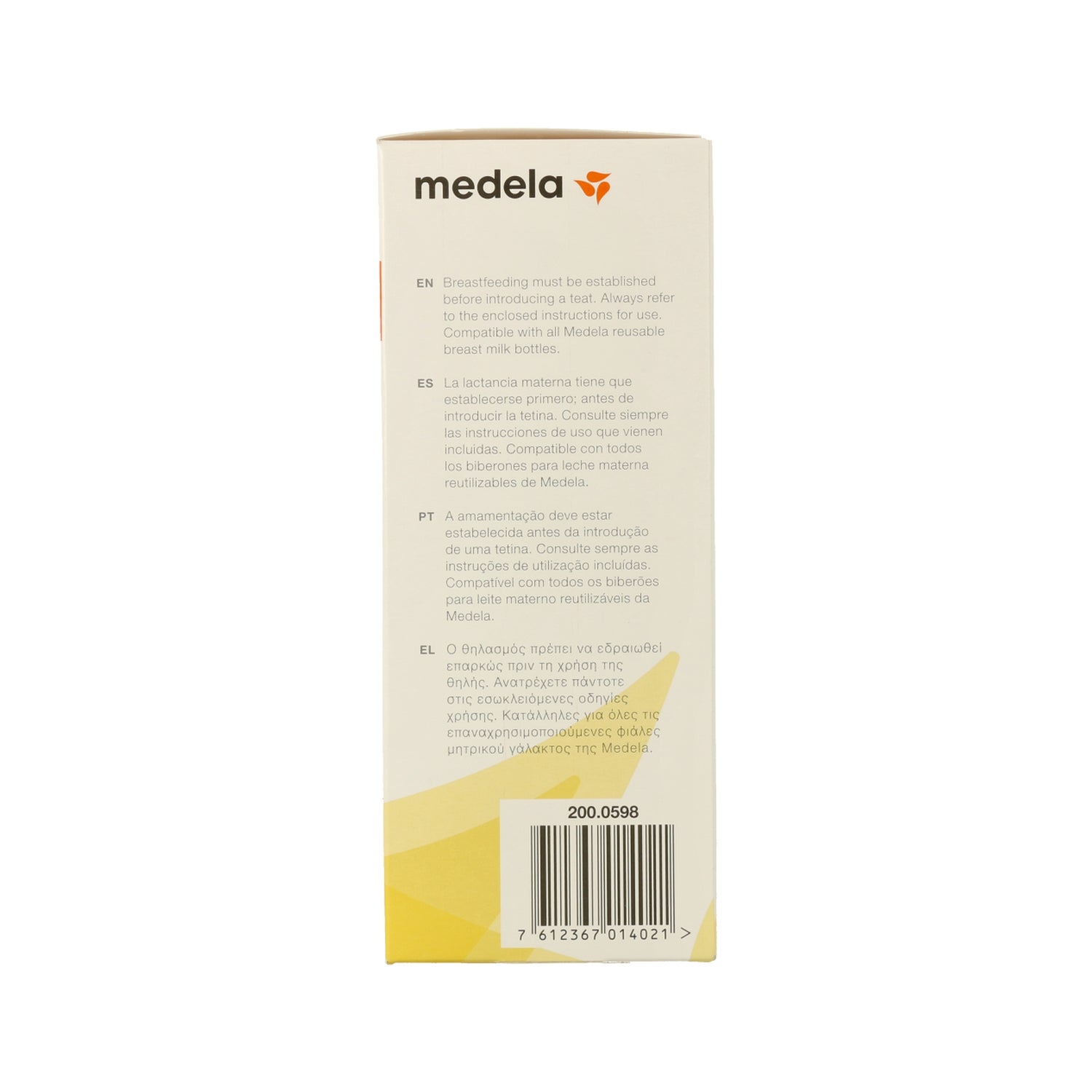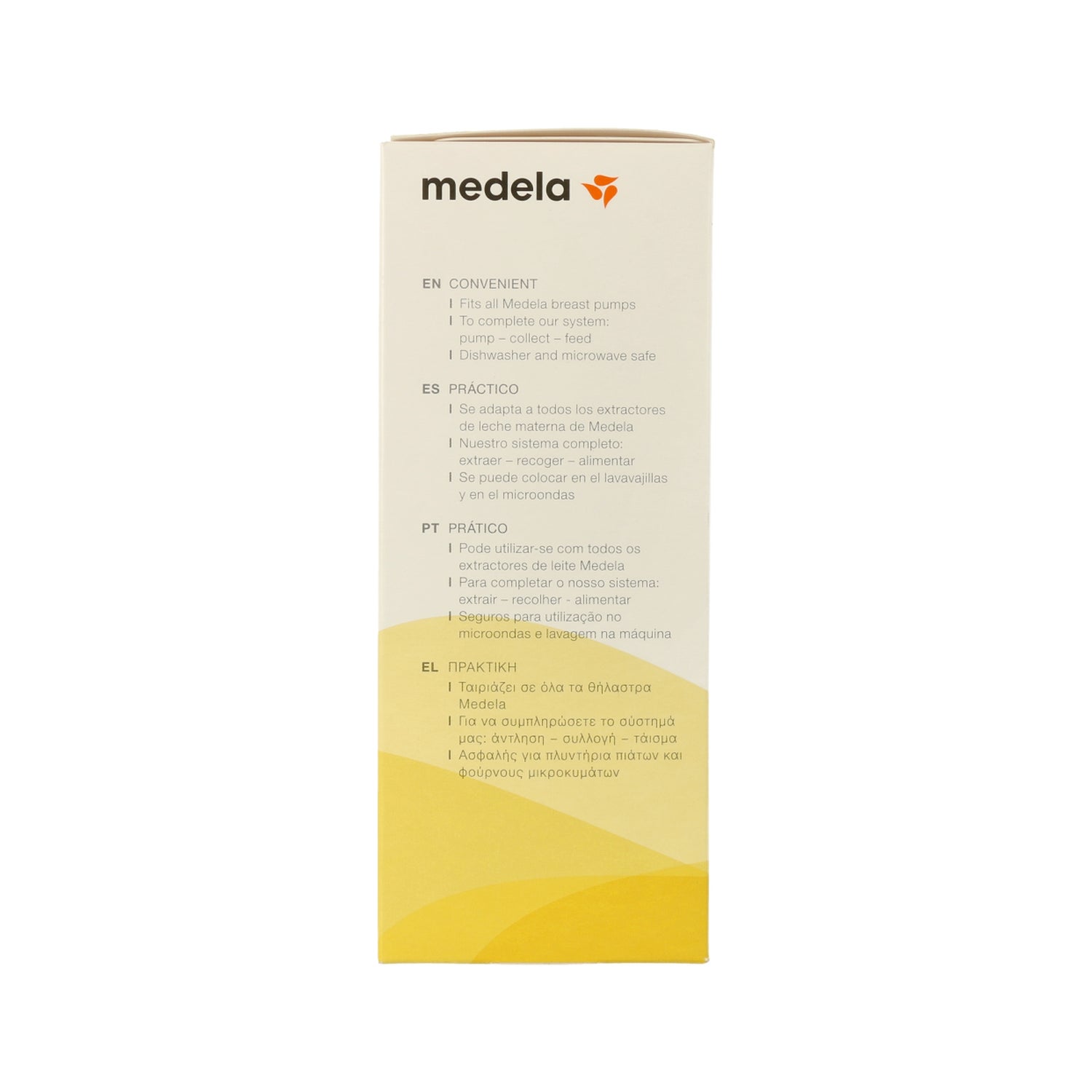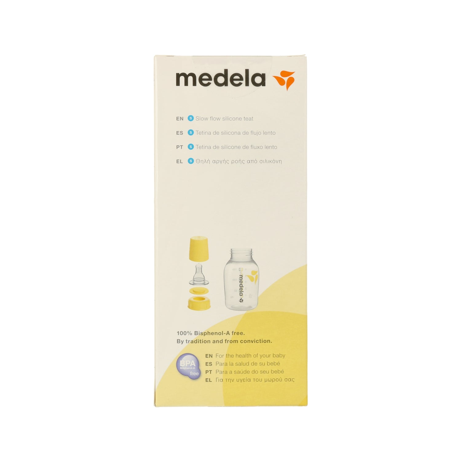 It has a capacity of 150ml. It is a complete pack consisting of the bottle-bottle, slow-flow nipple S, screw cap, disc cap and bottle cap cover and is very practical because it fits all Medela breast pumps. Dishwasher and microwave safe.