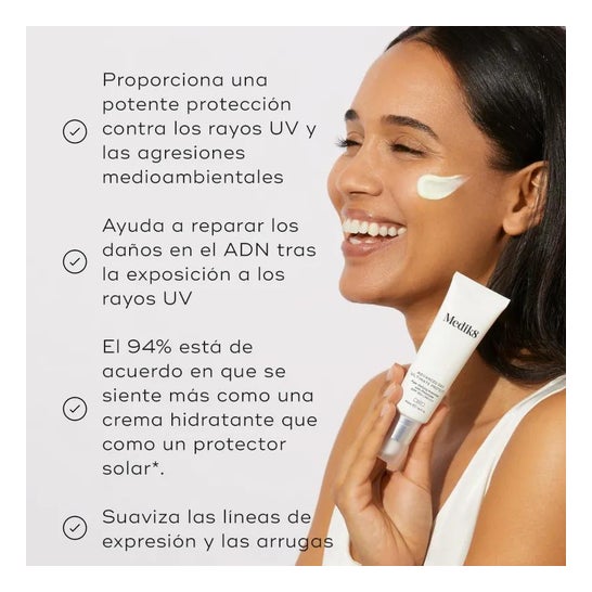 Made with a combination of photostable filters, it protects the skin from UVA and UVB rays, as well as blue light and infrared. Its formulation includes encapsulated photolyase that helps support the skin's natural repair mechanisms.