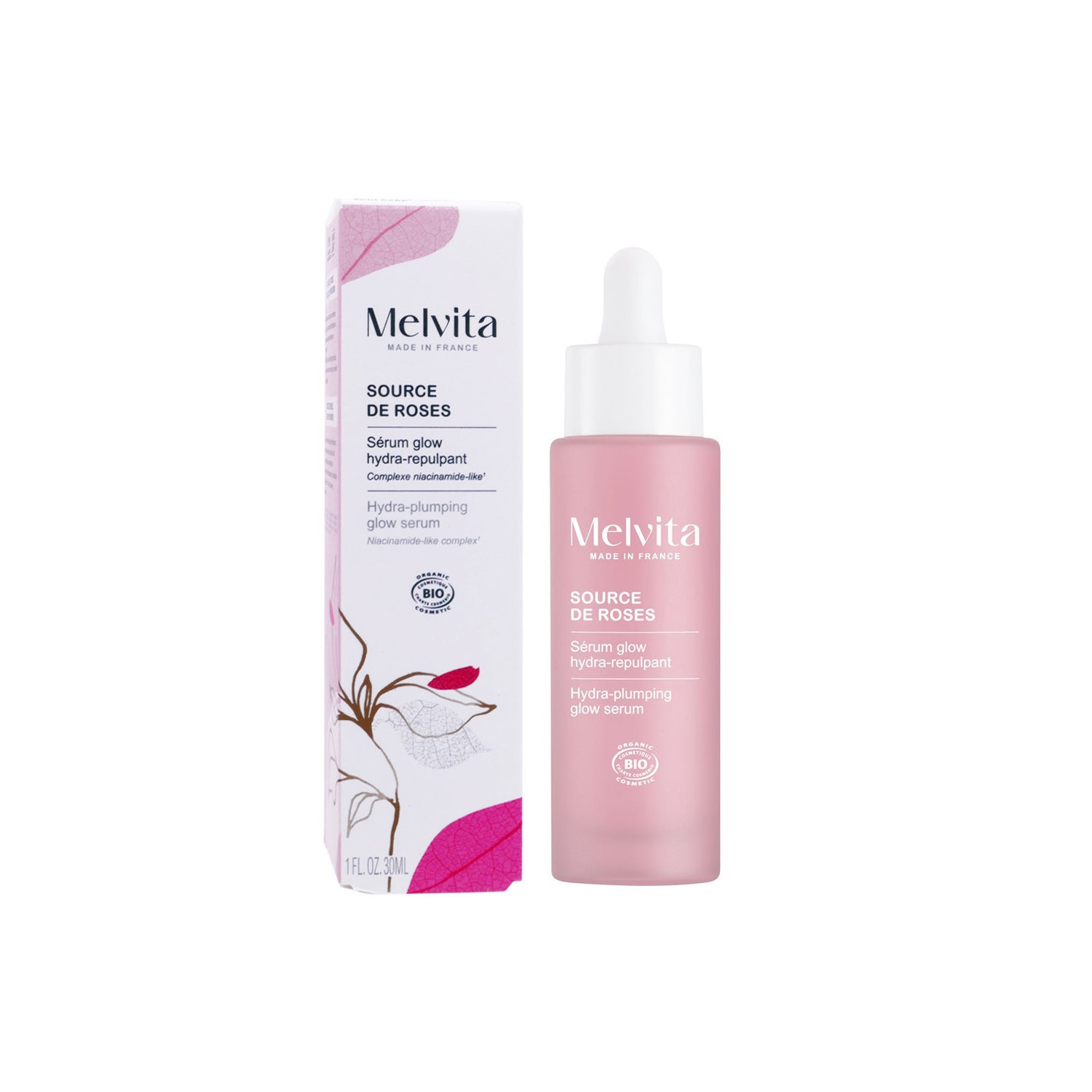 Melvita Source de Roses Glow Hydra Plumping Serum is a facial treatment that combines multiple benefits in a single product. This 3-in-1 serum is presented as a solution that hydrates, smooths, and adds radiance to the skin with just one application.