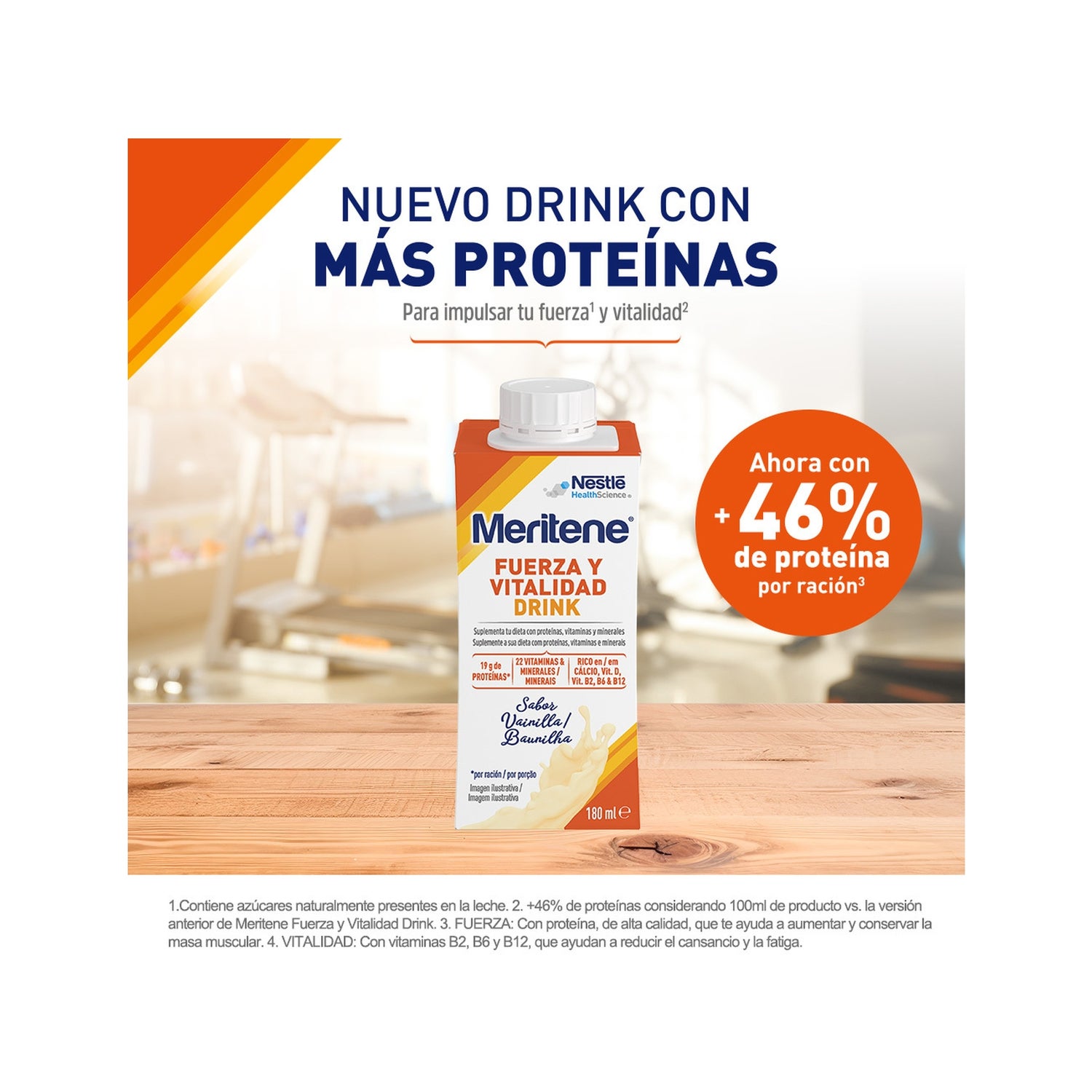 Meritene Pack Drink Vanilla 12x125ml is a food supplement rich in proteins, vitamins and minerals that contribute to combat the feeling of tiredness, fatigue and muscle weakness. Its presentation in shake format makes them convenient to take anywhere and at any time of the day. It also helps to complement the diet in case of high physical exhaustion or nutritional imbalance. Contains 12 small bottles of 125ml each.