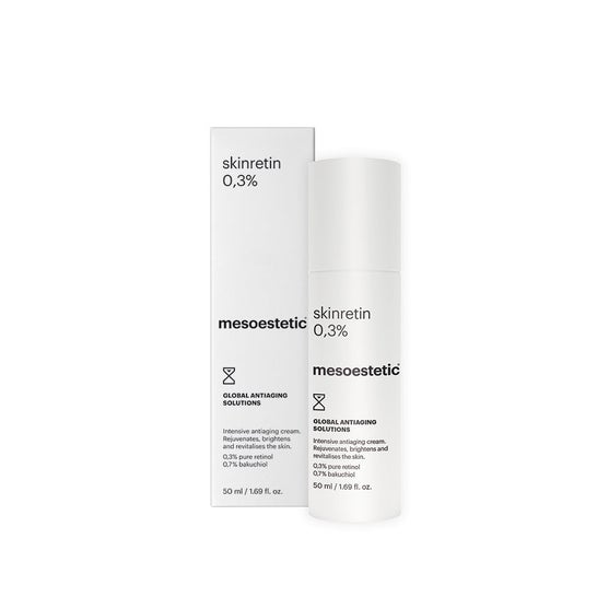 Mesoestetic Skinretin 0.3% 50ml is a lightweight night cream designed to address the signs of aging on multiple levels. This product focuses on treating: