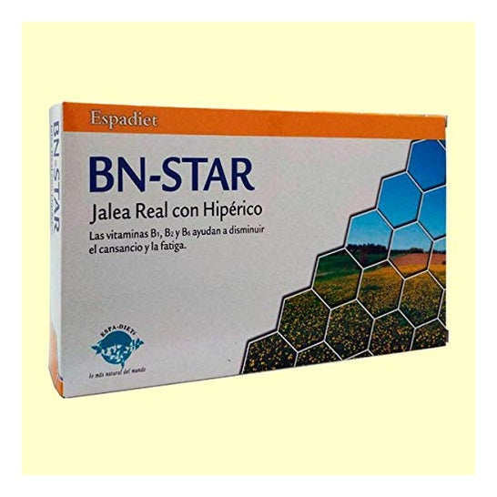 Dietary supplement formulated to contribute to the immune system. Product developed by Espadiet to try to improve the body's defenses. In the preparation of Jelly Bn-Star no chemicals or artificial products have been used, as in the rest of the manufacturer's articles. The composition contains: Royal Jelly, Taurine, L-Tyrosine, L-Carnitine, Hypericum concentrate, Vitamin C, Vitamin B1, Vitamin B2, Vitamin B6, Orange flavouring, water and fructose.