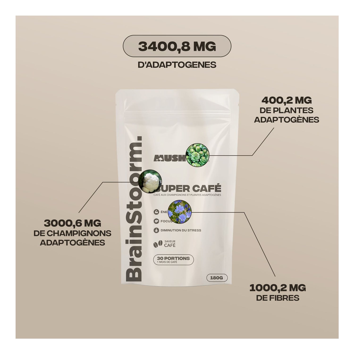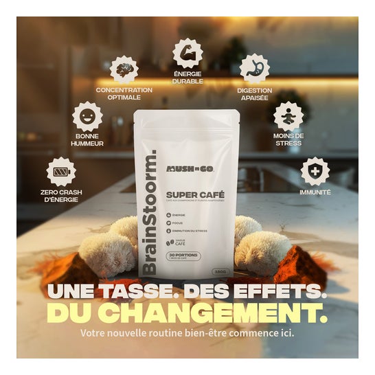 Mush N Go Café Adaptógeno Brainstoorm Coffee Flavor 180 g is a coffee substitute made from adaptogenic plants and mushrooms. This product is designed to:
