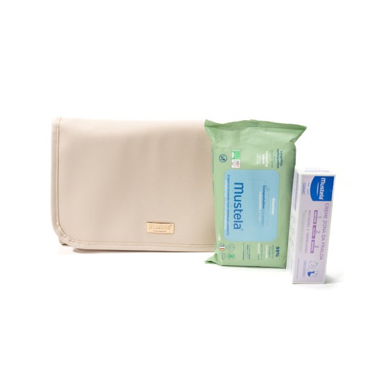 The design of the kit stands out for its durability and elegance, using high-quality materials and a secure closure that ensures its longevity. Additionally, it is designed to offer efficient organization, with enough space to store wipes and a sturdy elastic that holds the Mustela Creme Zona de la Fralda 1>2>3.