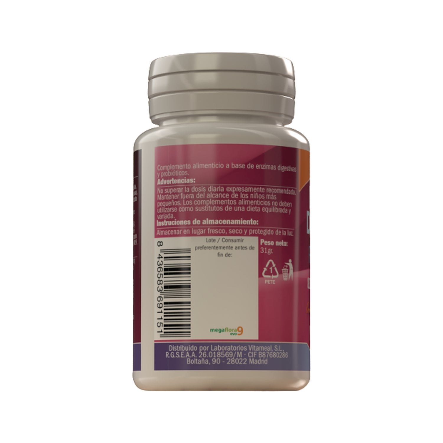 Food supplement based on digestive enzymes and probiotics. Suitable as a supplement to any diet. Digestive enzymes help to improve digestion, while probiotics contribute to an improvement of the microbial balance and intestinal flora, promoting good intestinal transit.