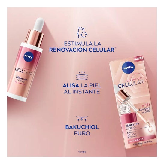 Nivea Cellular Expert Lift Serum 3 Zones with Bakuchiol 30ml is a treatment designed to provide a lifting effect in three key areas: the face, neck, and décolletage. This serum works deeply at the cellular level, promoting a visible improvement in firmness and elasticity of the skin.