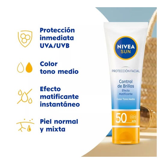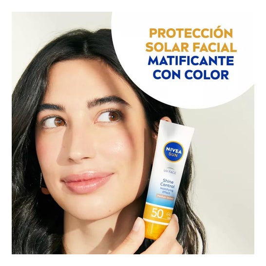 Nivea Sun Facial Sun Cream Shine Control SPF50 40ml is a facial sunscreen that helps protect the skin from the action of UVA/UVB rays and the effects of high-energy visible light (HEVL), thanks to its photostable filters SPF50. It is indicated for normal to dry skin due to its moisturizing formula that includes color pigments that help to unify the tone of the face. Contains 40ml.