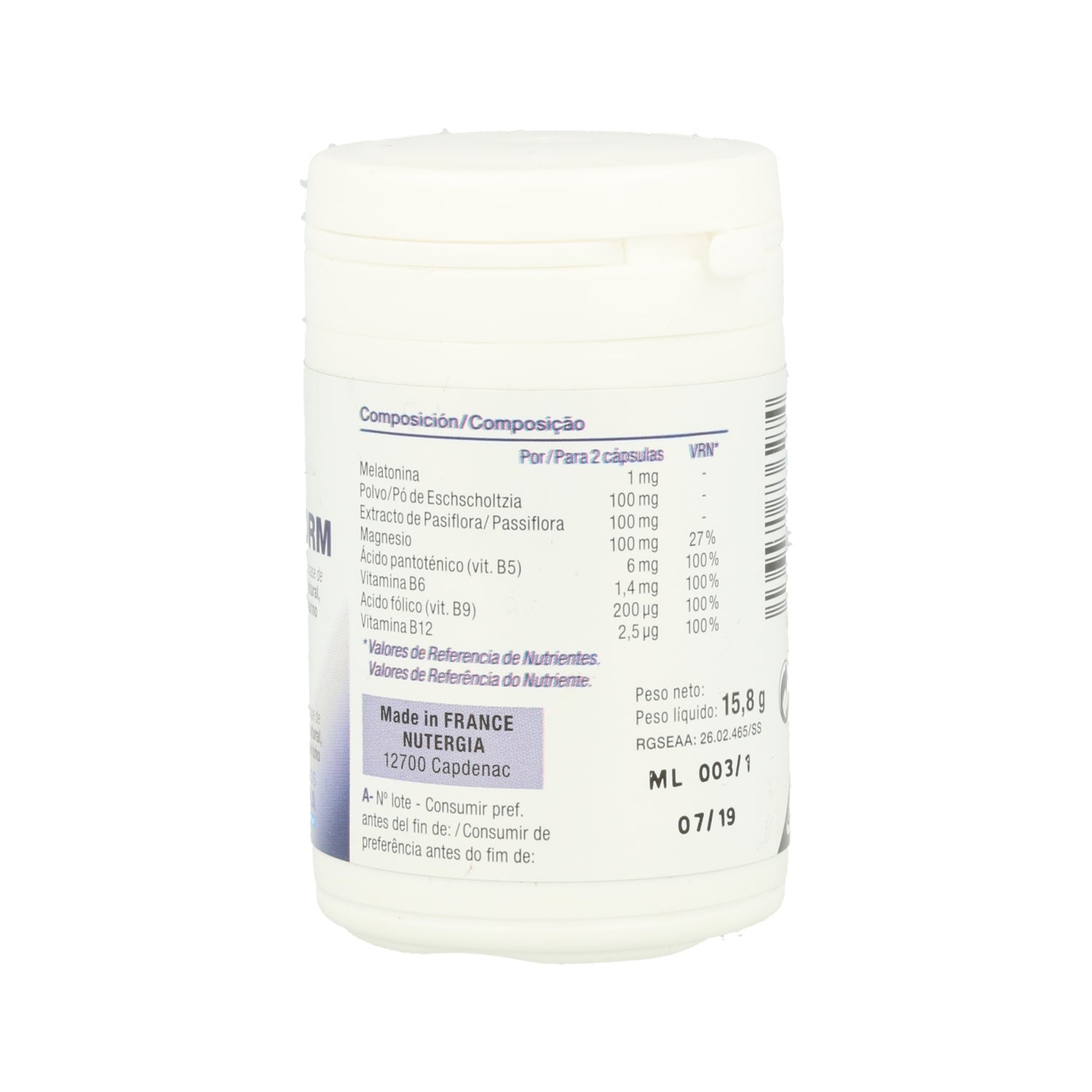 Folic acid (200 μg), Magnesium (100 mg), Passionflower extract (100 mg), Schscholtzia powder (100 mg), Pantothenic acid (6 mg), Vitamin B12 (2.5 μg), Vitamin B6 (1.4 mg), Melatonin (1 mg), Marine magnesium, Soy lecithin, Iron oxide, Cherry powder, Fish gelatin, Dicalcium phosphate.
