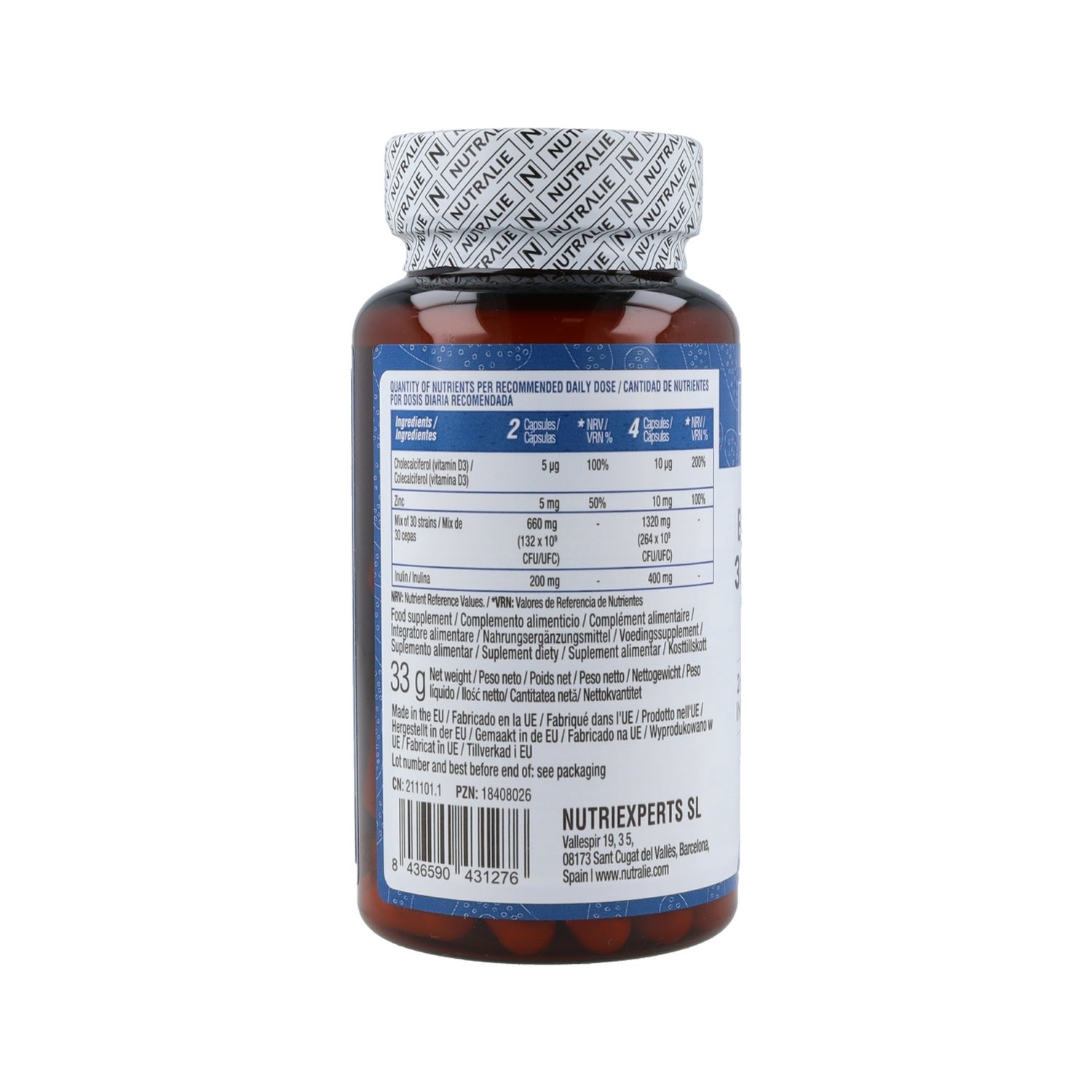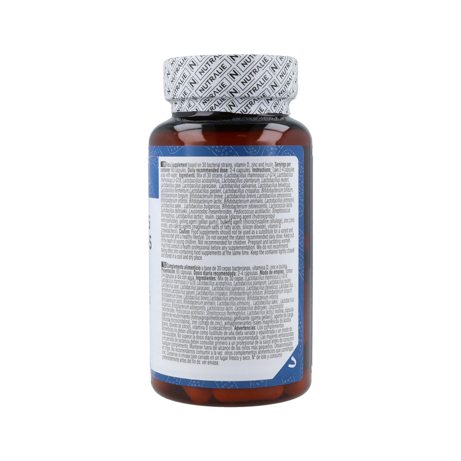 Mix of 30 strains (Lactobacillus acidophilus, Lactobacillus reuteri, Lactobacillus rhamnosus GG, Lactobacillus rhamnosus, Lactobacillus salivarius, Lactobacillus brevis, Lactobacillus paracasei, Lactobacillus gasseri, Lactobacillus helveticus, Lactobacillus casei, Lactobacillus crispatus, Lactobacillus fermentum, Bifidobacterium infantis, Bifidobacterium bifidum, Bifidobacterium longum, Bifidobacterium lactis, Bifidobacterium breve, Pediococcus acidilactici, Streptococcus thermophilus, Lactobacillus lactis, Bifidobacterium animalis, Lactobacillus Johnsonii, Lactobacillus amylovorus, Lactobacillus sakei, Lactobacillus plantarum, Lactobacillus bulgaricus, Bifidobacterium adolescentis, Lactococcus lactis, Lactobacillus delbruekii, Leuconostoc mesenteroides); inulin, coating agent (hydroxypropyl methylcellulose), bulking agent (microcrystalline cellulose), zinc citrate, anti-caking agents (magnesium stearate, silicon dioxide), gelling agent (gellan gum), cholecalciferol (vitamin D).