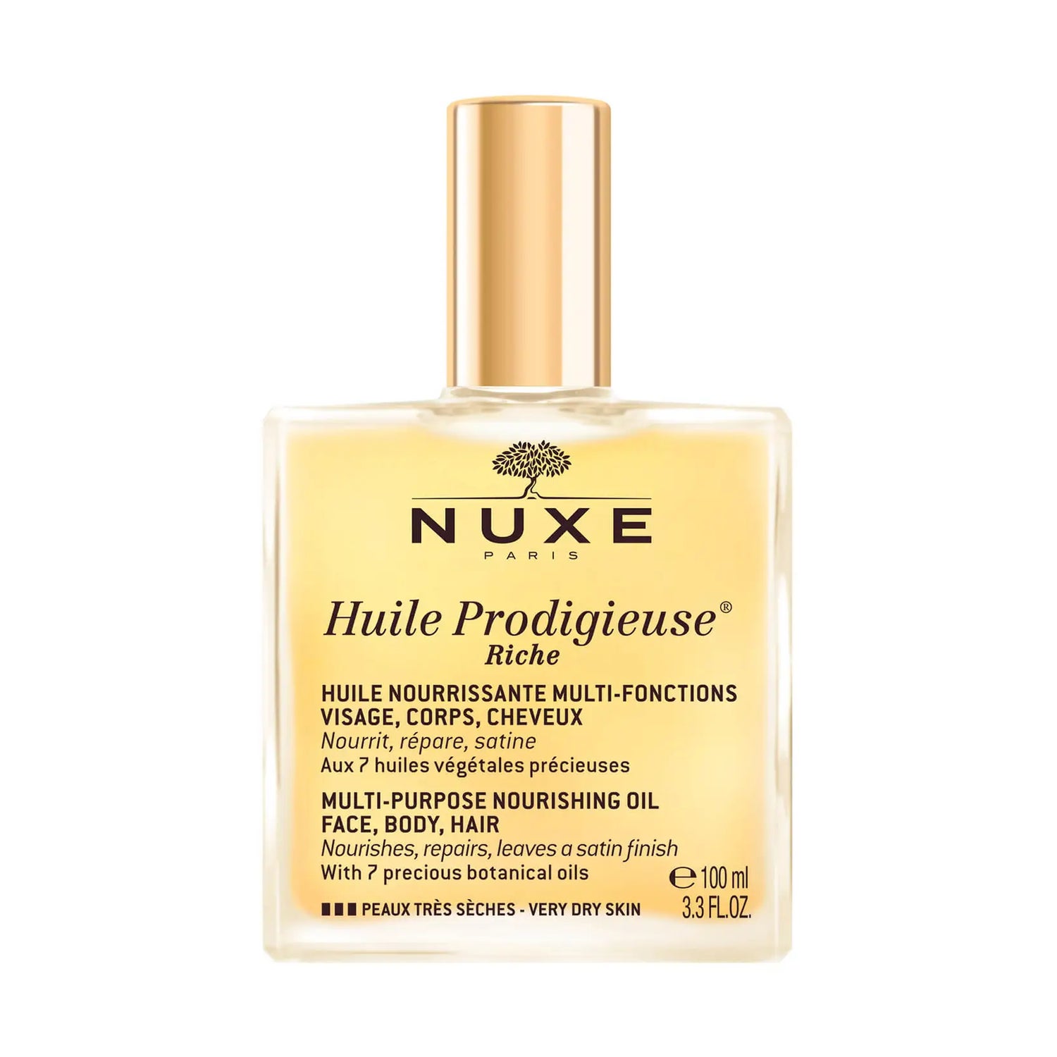 Nuxe Huile Prodigieuse Riche 100ml is a spray oil that contains 98.1% of natural ingredients. It has multiple functions, including nourishes, repairs and softens the skin and is suitable for the care of face, body and hair. As a result, the skin is deeply nourished and hair is shinier and softer.