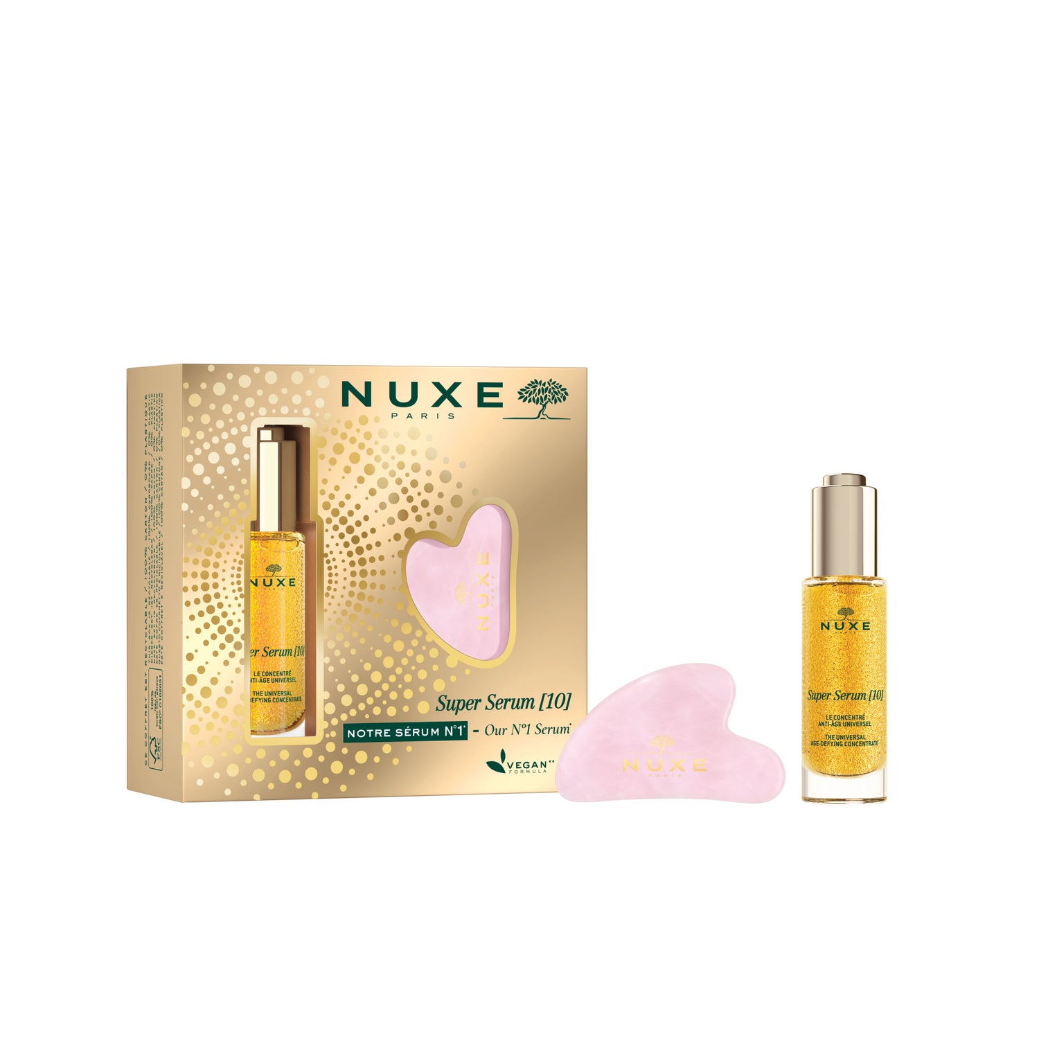 Nuxe Our Serum Set Nº1 is a set that contains a Super Serum [10] 30ml and a Gua Sha de jade.