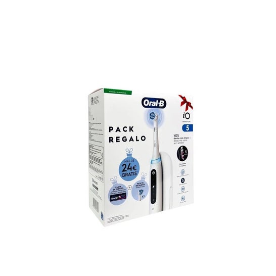 Oral-B Pack iO5 Laboratory 2 Brushes + Refills + Daily Oral Hygiene Toothpaste includes two iO5 electric brushes with iO magnetic technology, Ultimate Clean refills, and toothpaste. It is a complete solution for daily oral hygiene in adults.