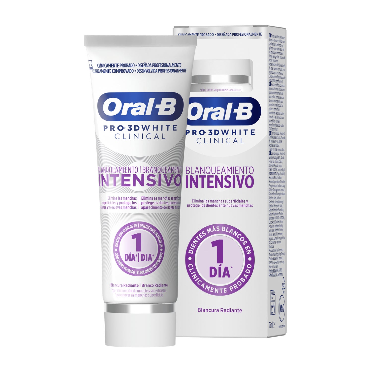 Oral-B 3DW Clinical Toothpaste 75 ml Intensive Whitening is a toothpaste for adults, designed to achieve visibly whiter teeth from day one. It helps remove surface stains thanks to its ionic technology, with a gentle action that does not require aggressive scrubbing.