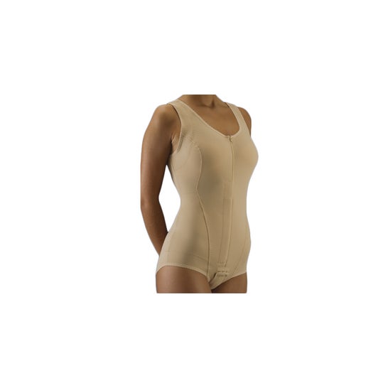 Female body in beige color that is designed to be used as a dorsolumbar orthosis with a thermoformable back plate, a lumbar traction, abdominal support and a pectoral breast area in thinner and lighter elastic Lycra, and is indicated for patients with osteoporosis, degenerative processes, arthritis, muscular hypotonia, dorsalgias whenever a complete support of the dorsolumbar rachis is required. The body incorporates a thermoplastic dorsolumbar plate that can be adapted to the patient's morphology by applying thermoformed hot air. Once the plate has been adapted, it will be introduced through the inner pocket on the dorsal side of the Bod, inserting it from the bottom upwards. Size 85 corresponds to a hip perimeter of 81-85cm.