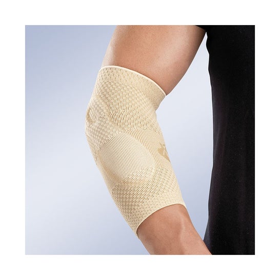 Elastic elastic elbow brace in beige color that incorporates a viscoelastic material pads that is made of an elastic knitted fabric breathable through flat knitting. It provides a dosed compression to help relieve pain and eliminate tensions, thanks to the pads redistribute the compression of the bandage from the prominent epicondyles to the soft parts around them.