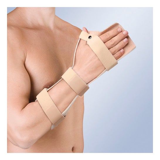 Immobilising splint for the hand designed by Orliman. There are models for left and right hand, designed with thermoplastic material. In addition, its inner side contains absorbent terry, which provides comfort and prevents sweating. With straps that allow for proper adjustment at wrist and forearm level, as well as a velvet safety pin for the thumb. Its function is to limit the mobility of the wrist, hand and fingers, keeping them with a small flexion with respect to the thumb.