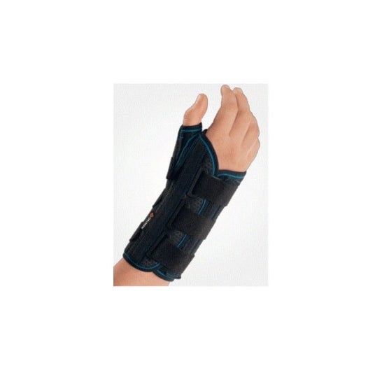 INFORMATION2 moldable aluminum splints (lateral and palmar removable), lateral splint provided with a support: prevents incorrect rotation of the thumb, adjustment by straps and anti-torsion buckles, crab clamp released by combining a strap and a support for the thumb, available in universal size with dorsal splint adjustable to the wrist (variable circumference).INDICATION Trauma and sprain of the wrist and thumb, scaphoid injury, De Quervain's tendinitis, acute stage rhizarthrosis.