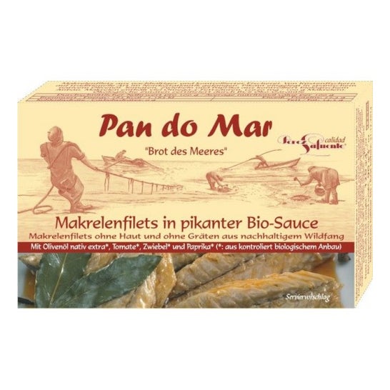 Mackerel fillets in spicy sauce, with ingredients obtained by artisanal fishermen. With extra virgin and organic olive oil. Contains essential amino acids such as omega 3, which help protect cardiovascular health. It has a high content of vitamins A, B2, B3, B6, B9, and D that promote and stimulate the formation of red blood cells. With minerals such as potassium, phosphorus, iodine and magnesium. The non-use of nets is a guarantee for the quality and freshness of the fish used in this product.