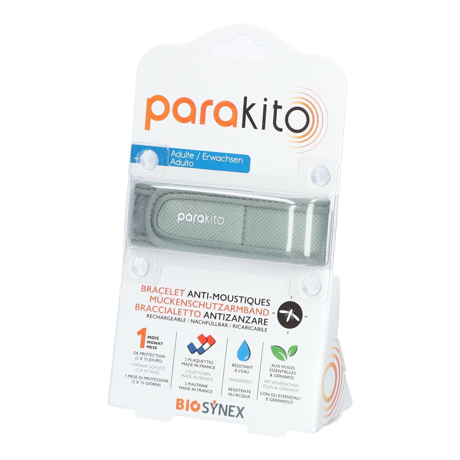 Para'Kito Mosquito Repellent Bracelet Adult Kit Khaki + 2 Refills is an effective solution for protection against mosquitoes. This practical khaki bracelet comes as a rechargeable device that includes two refills impregnated with an exclusive formula based on essential oils, ensuring defense against insect bites.