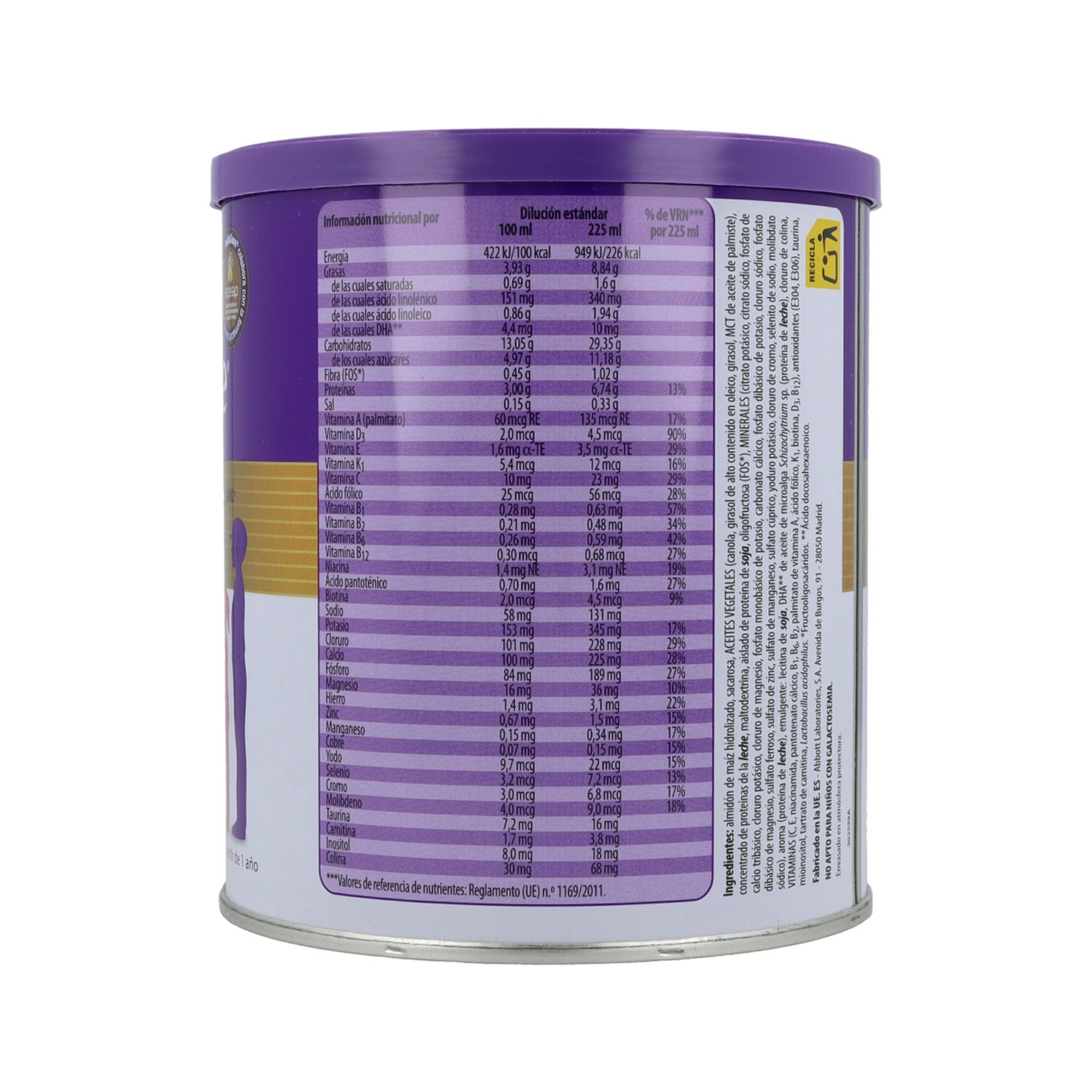 Hydrolysed corn starch, sucrose, milk protein concentrate, soybean oil, high oleic sunflower oil, minerals: (potassium citrate, dibasic magnesium phosphate, potassium chloride, sodium chloride, tribasic calcium phosphate, monobasic potassium phosphate, calcium carbonate, dibasic potassium phosphate, iron sulphate, zinc sulphate, manganese sulphate, copper sulphate, potassium iodide, chromium chloride, sodium selenite, sodium molybdate), whey protein concentrate (milk protein), MCT oil, soy protein isolate, fructo-oligosaccharides, flavouring, docosahexaenoic acid from oil of C. cohnii (soybean) oil, choline chloride, vitamins: (ascorbic acid, ascorbyl palmitate, dl-alpha tocopherol acetate, d-calcium pantothenate, niacinamide, pyridoxine hydrochloride, thiamine hydrochloride, riboflavin, vitamin A palmitate, folic acid, phylloquinone, biotin, vitamin D3, cyanocobalamin), arachidonic acid from M. apine (soya), taurine, M-inositol, L-carnitine tartrate, lactobacillus acidophilus, antioxidant: E306, bifidobacterium lactis.