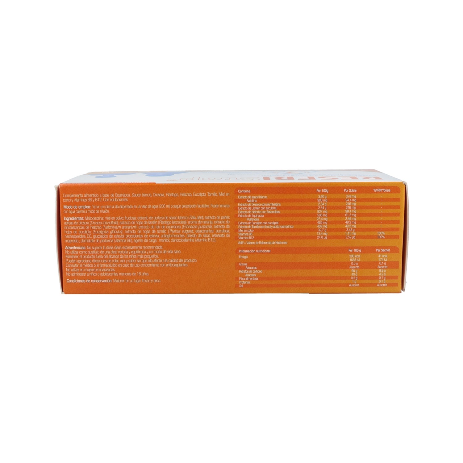 Food supplement that supports the immune system against free radicals. It contains helichrysum which has antihistamine and expectorant properties. It also includes plantago lanceolata which helps soothe the throat and pharynx. Drosera rotundifolia which acts as antitussive and mucolytic. Echinacea purpurea helps to increase defenses. Thyme and eucalyptus are expectorants and decongestants. Honey has a soothing and energizing effect. Vitamins B6 and B12 help the normal functioning of the immune system, reduce tiredness and fatigue.