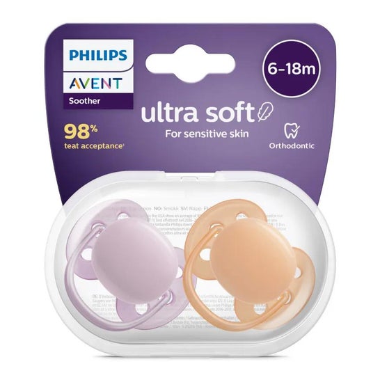 Set of two soothers with anatomical silicone teat and ventilation holes. Helps to satisfy the baby's natural sucking instinct while respecting the natural growth of teeth and gums. Suitable for babies between 6 and 18 months.