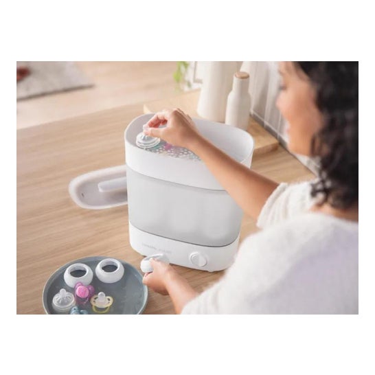 The device has the capacity for six bottles and accessories, offering a complete solution without taking up too much space in the kitchen. The advanced technology of this sterilizer ensures the elimination of 99.9% of germs, guaranteeing that the bottles are ready and safe for your use.
