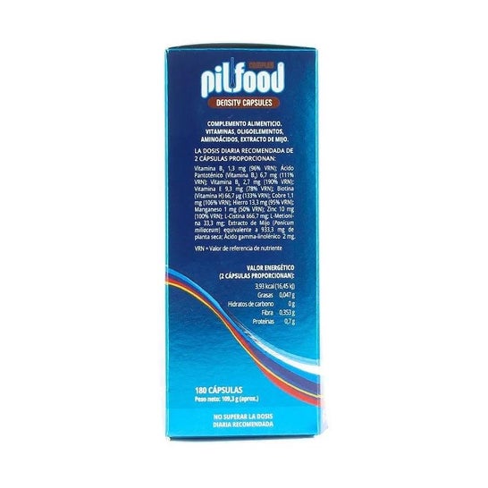 Pilfood Complex Density 180caps fights hair loss from the inside, interacting in the hair bulb itself, which is the living part of the hair. It is suitable for men and women with hair loss, fragile or damaged.contains: zinc and biotin (contributes to the maintenance of hair in normal conditions); dry millet extract (helps form keratin); Vitamins B2, B5, B6, E and H (slows hair deterioration); methionine and cystine (help produce hair); iron, copper, manganese and zinc (stimulate hair growth and recovery); gamma-linolenic acid (provides strength and shine). For best results, it is necessary to take this nutrient-rich food supplement for a period of at least 3 months. The first visible effects are noticeable after 6-8 weeks of continuous use.