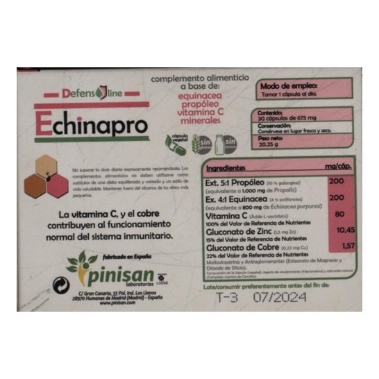 Dietary supplement that contributes to the normal functioning of the immune system. Contains propolis and echinacea in the form of titrated extracts, to ensure a greater and constant presence of its active ingredients. It is also formulated with Zinc, Copper and Vitamin C, which contribute to the normal functioning of the immune system. Each capsule provides active ingredients equivalent to more than 1,800 mg. Pack containing 30 capsules. Vegetable capsule, gluten-free and lactose-free.