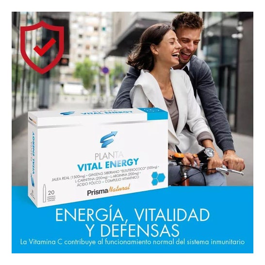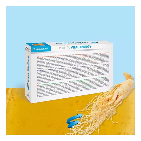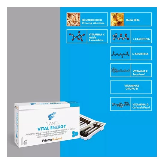 Plantavital Energy 20 Amp 10Ml Prisma Natural is a food supplement from Prisma Natural that combines royal jelly, eleutherococcus, amino acids and vitamins. It is formulated to combat fatigue and stress, as well as to promote overall physical and mental well-being. This product contributes to increase vitality and energy, providing essential nutrients for the body. It also helps to improve digestion and reduce abdominal inflammation. It is especially recommended for those who wish to boost their health and maintain an active and healthy lifestyle.