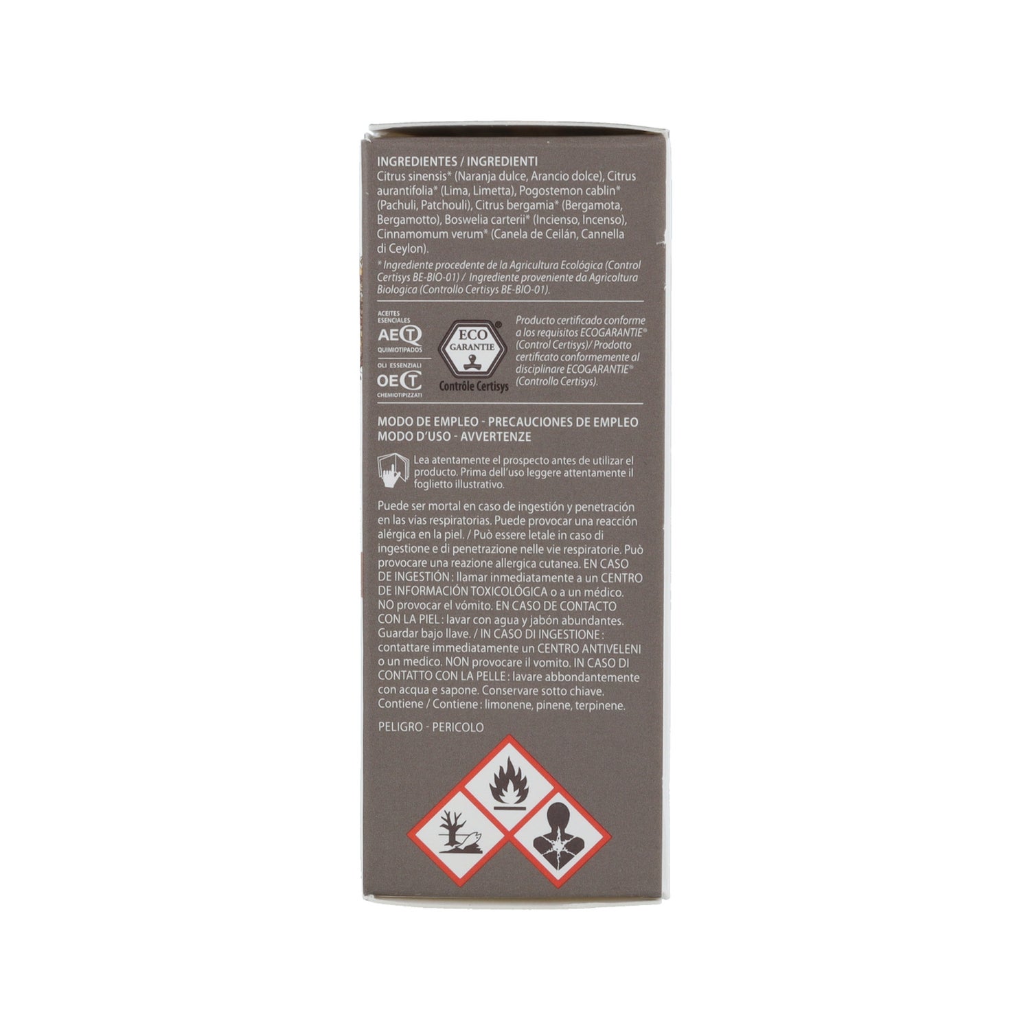 CITRUS SINENSIS* (SWEET ORANGE), CITRUS AURANTIFOLIA* (LIME), POGOSTEMON CABLIN* (PATCHOULI), CITRUS BERGAMIA* (BERGAMOT), BOSWELLIA CARTERII* (INCENSE), CINNAMOMUM VERUM* (CINNAMON)(N), NARDOSTACHYS JATAMANSI* (HIMALAYAN TUBEROSE).