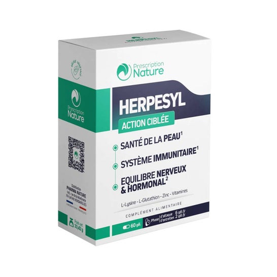 Prescription Nature Herpesyl is a dietary supplement in capsule form, designed to promote skin health and contribute to the balance of the nervous and hormonal systems. Its complete and 100% vegan formula includes L-Lysine, L-Glutathione, zinc, and various vitamins, allowing you to enjoy positive effects quickly and sustainably.