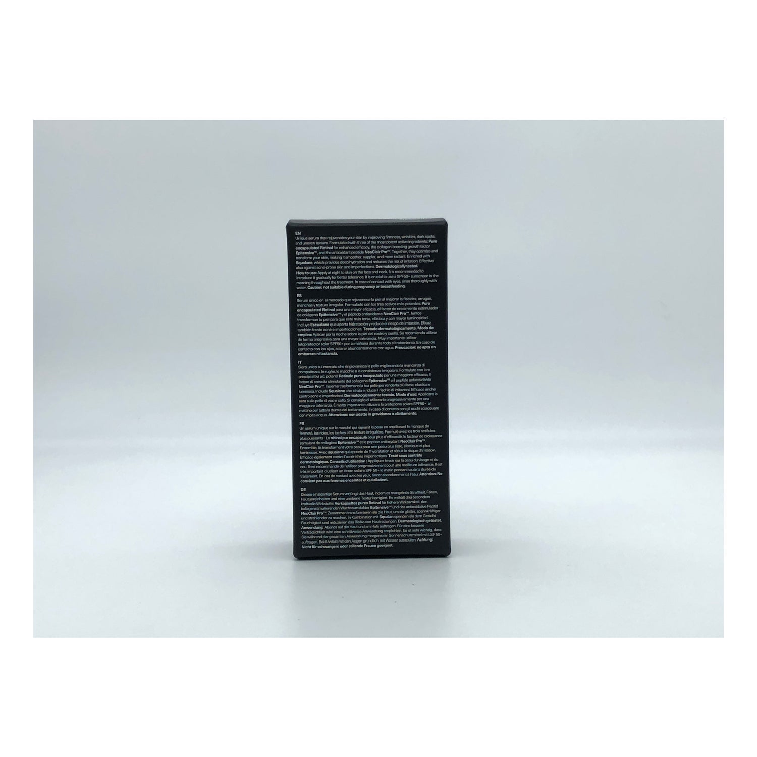 Do not use during pregnancy or while breastfeeding. In case of retinoid dermatitis (irritation, dryness, redness), use products like the Biodefense range to strengthen the skin barrier.