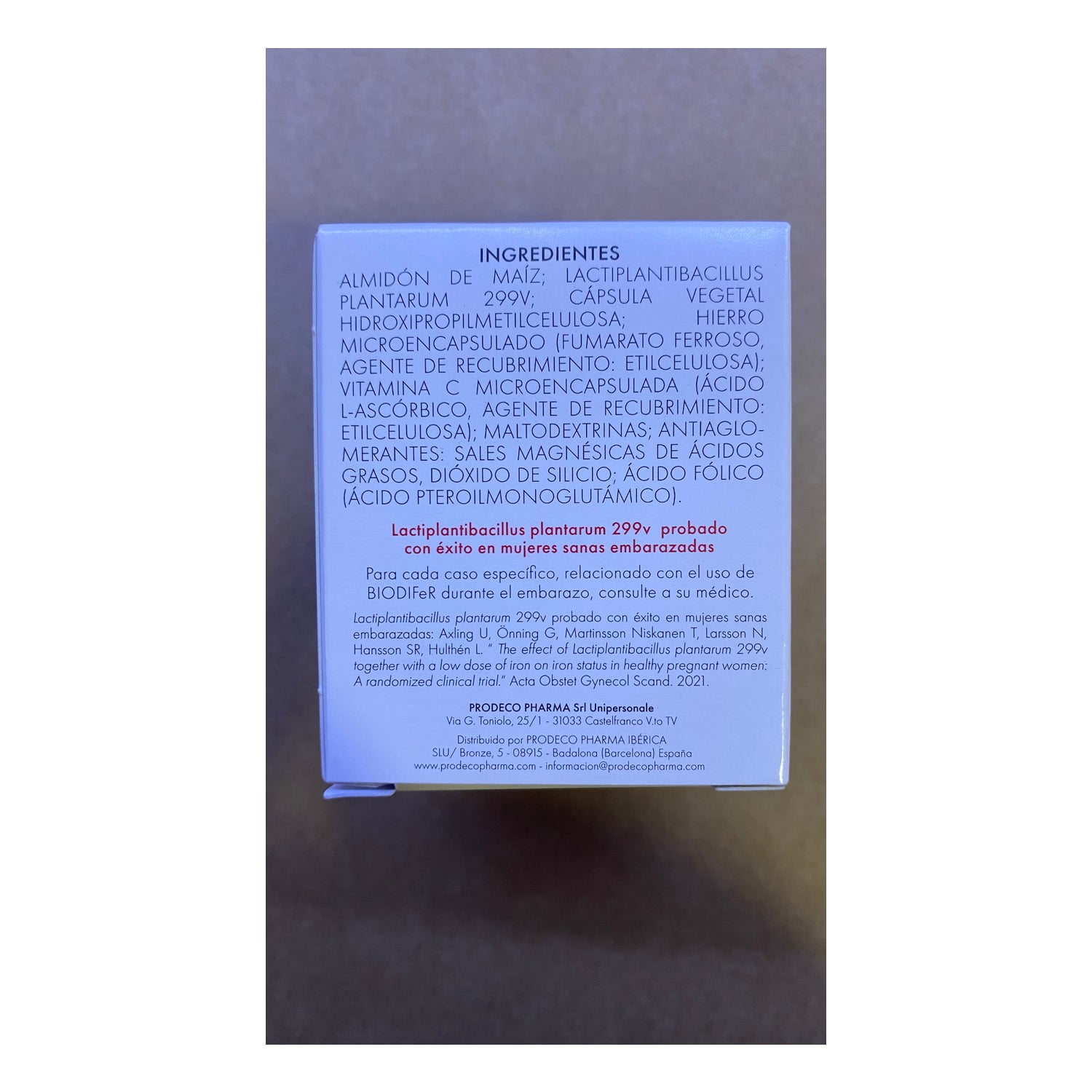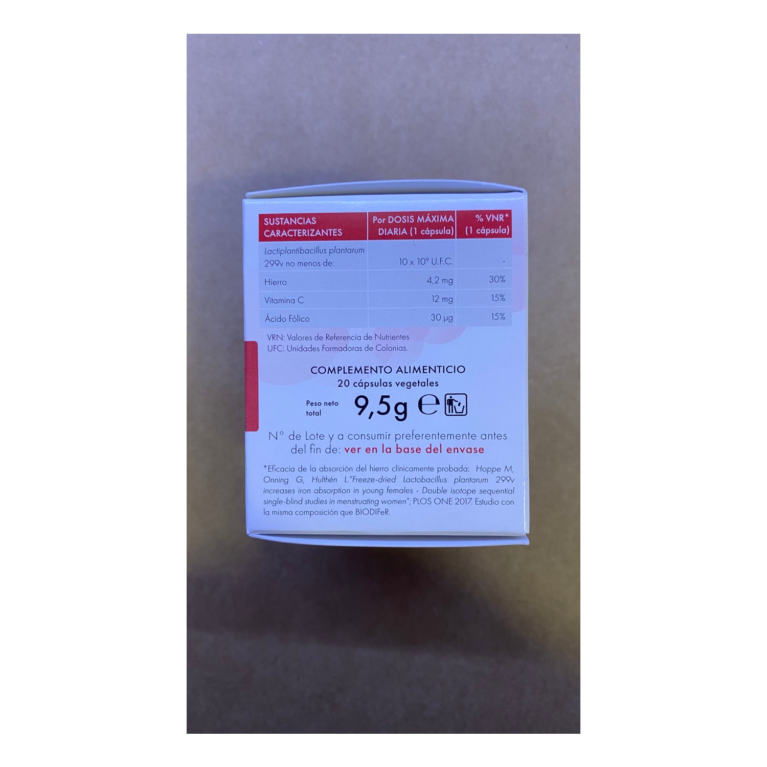 Corn Starch; Lactobacillus Plantarum 299v; Hydroxypropylmethylcellulose Vegetable Capsule; Microencapsulated Iron (Ferrous Fumarate, Coating Agent: Ethylcellulose); Microencapsulated Vitamin C (L-Ascorbic Acid, Coating Agent: Ethylcellulose); Maltodextrin; Anti-caking Agents: Magnesium Salts Of Fatty Acids, Silicon Dioxide; Folic Acid (Pteroylmonoglutamic Acid).
