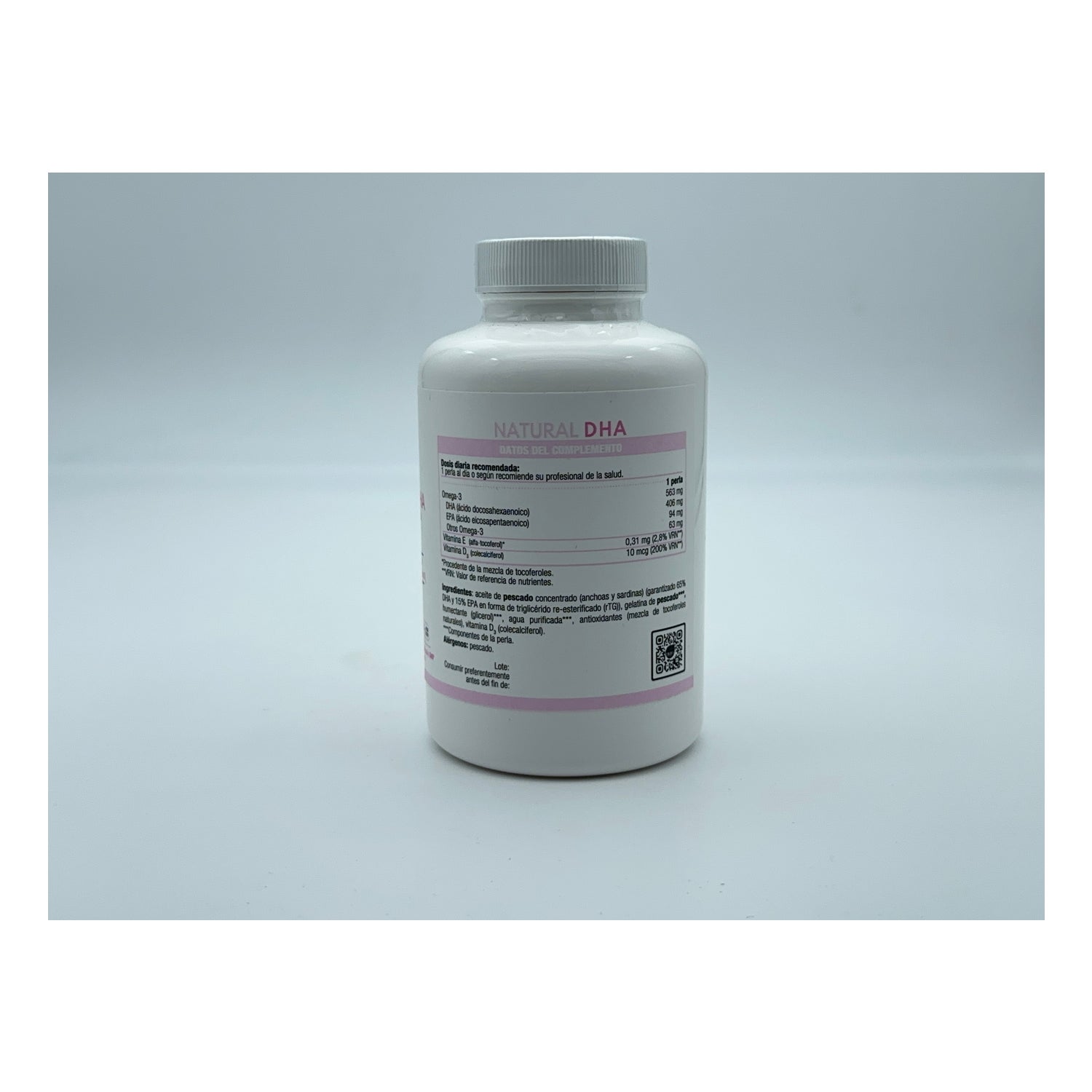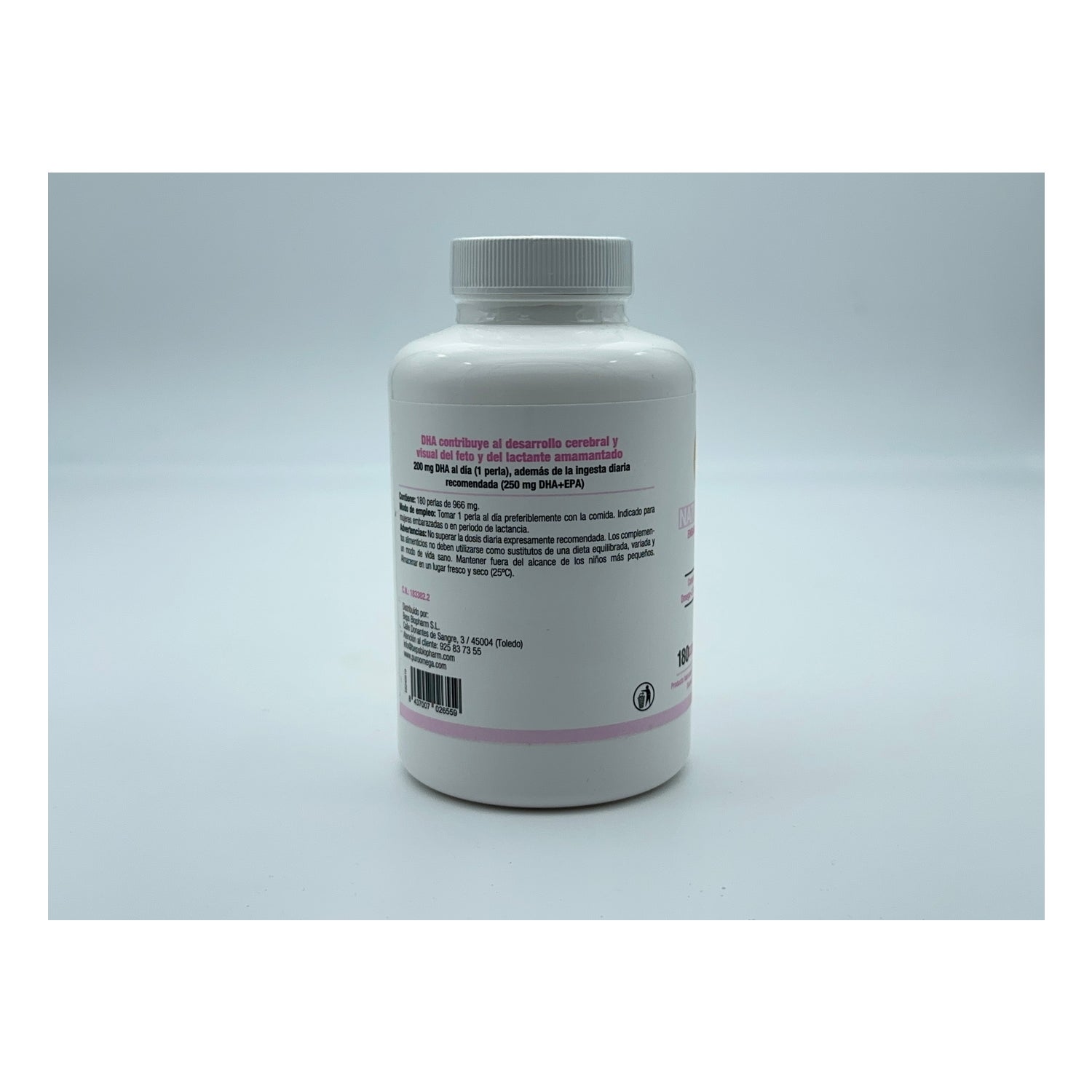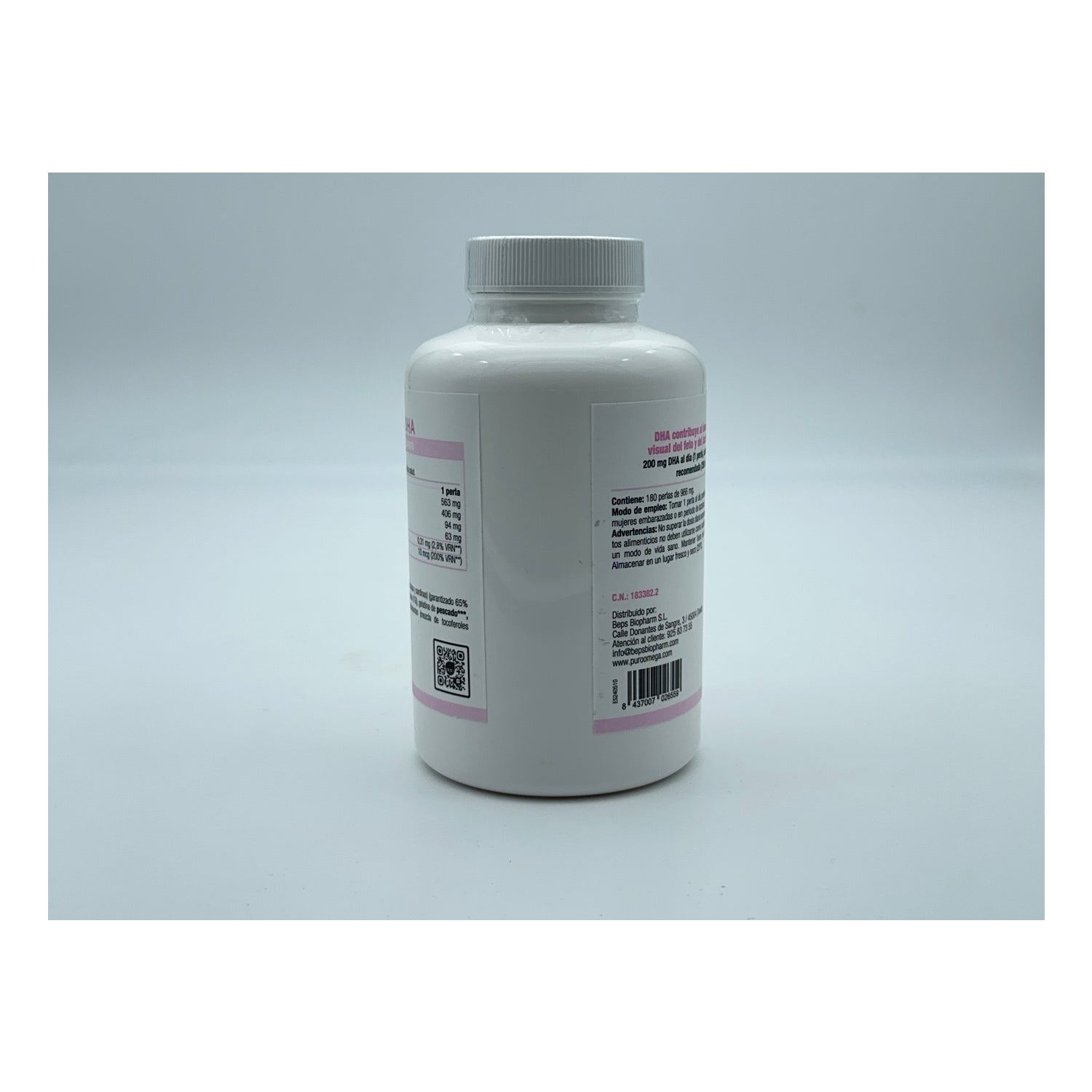 Dietary supplement in the form of soft pearls, made from omega 3 fatty acids from sardine and anchovy oil, with a high content of DHA (65%) and a lower concentration of EPA (15%), in addition to vitamin E, especially indicated to promote the proper development of the eyes, brain and nervous system of the fetus and baby during lactation. It also contributes to preventing food allergies in the baby and to improve cognitive performance and regulating the mother's cholesterol levels.
