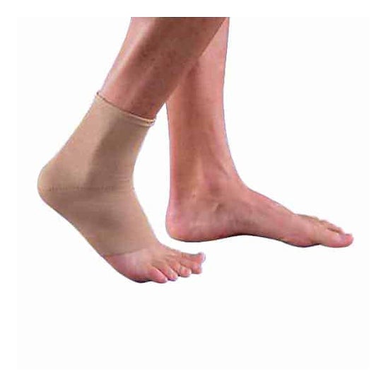 Seamless ankle brace that promotes ankle health during walking. Made of elastic knitted fabric, it provides compression, flexibility and good anatomical adaptability. Suitable for use with any footwear. Facilitates and stimulates blood circulation. With an open toe, without folds that provides comfort in use. It is discreet and thin, in beige colour. Easy to sanitise and is a durable product.