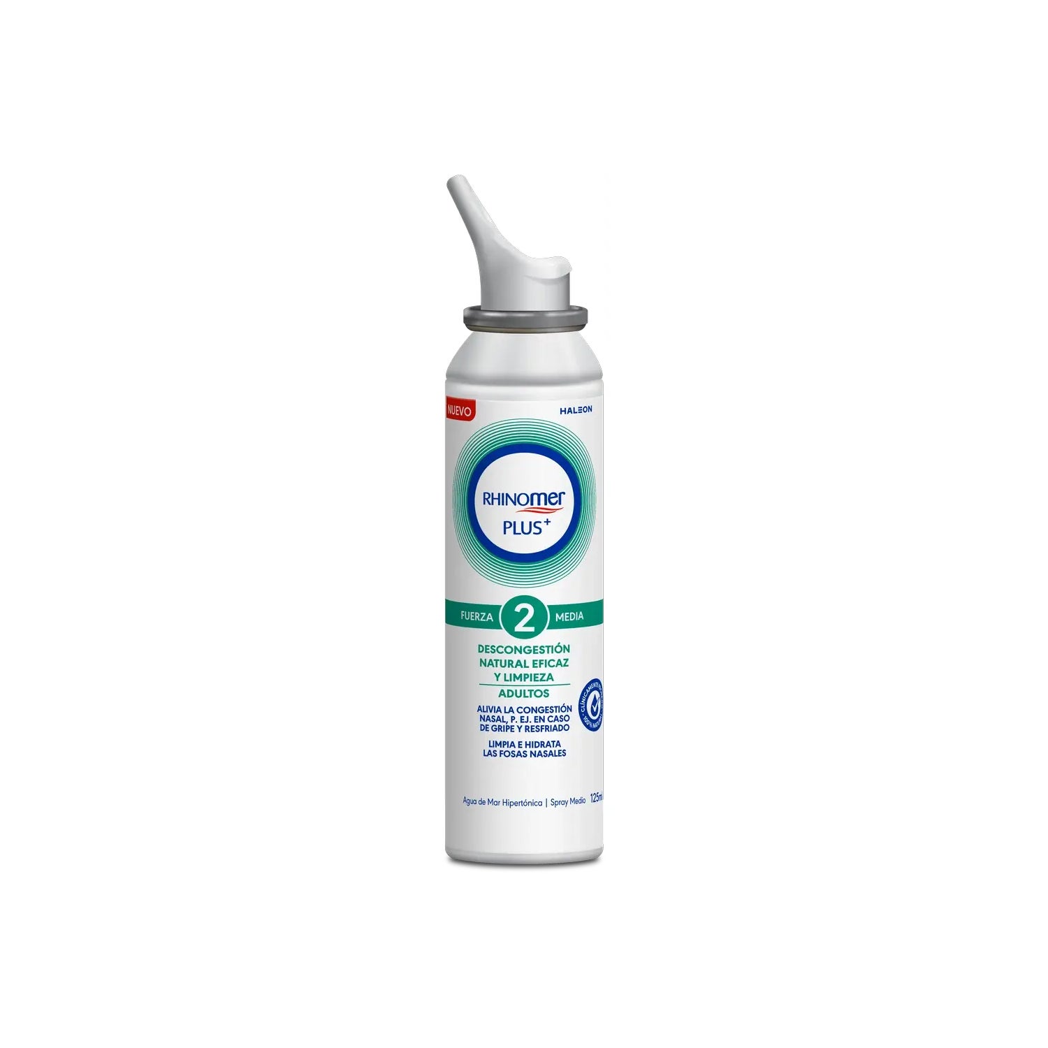 Rhinomer Plus 2 Medium Strength: 100% natural hypertonic seawater for adults and children from 6 years old. For the natural relief of nasal congestion in cases such as colds, nasal allergies, and rhinosinusitis.