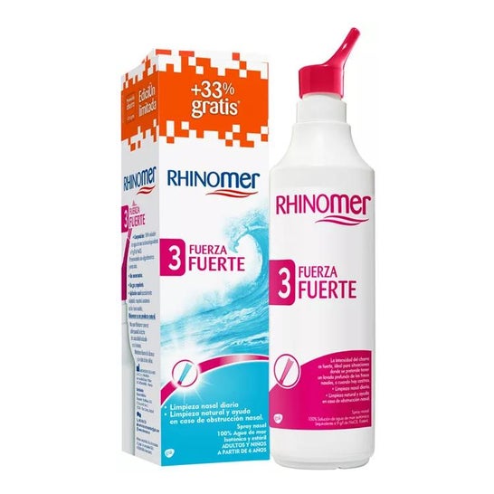 Rhinomer Nasal Spray Strength 3 135ml 45ml. High intensity and strength nasal spray. Contains 100% natural seawater, isotonic, sterile and natural water. No added chemicals or additional preservatives. Does not contain propellant gas. Indicated to support mild to moderate nasal congestion. Helps in the decongestion of the nasal passages while providing hydration.